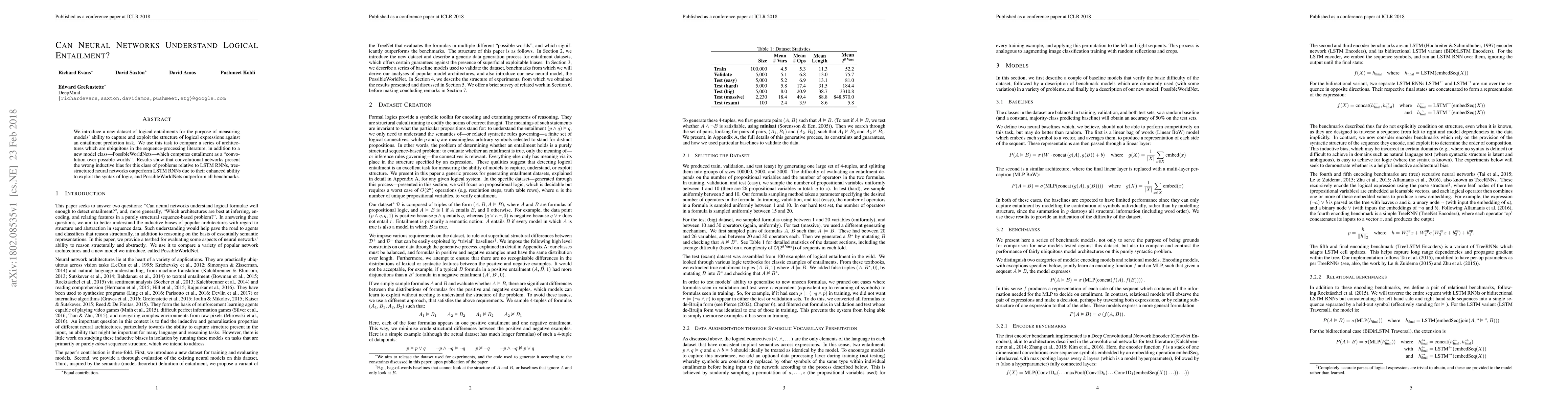 This paper evaluates various neural network architectures, including convolutional networks, LSTM RNNs, and tree-structured neural networks, on a new dataset for logical entailment prediction. Results indicate that tree structures excel due to their syntax exploitation, while PossibleWorldNets outperform all models by computing entailment through a "convolution over possible worlds."