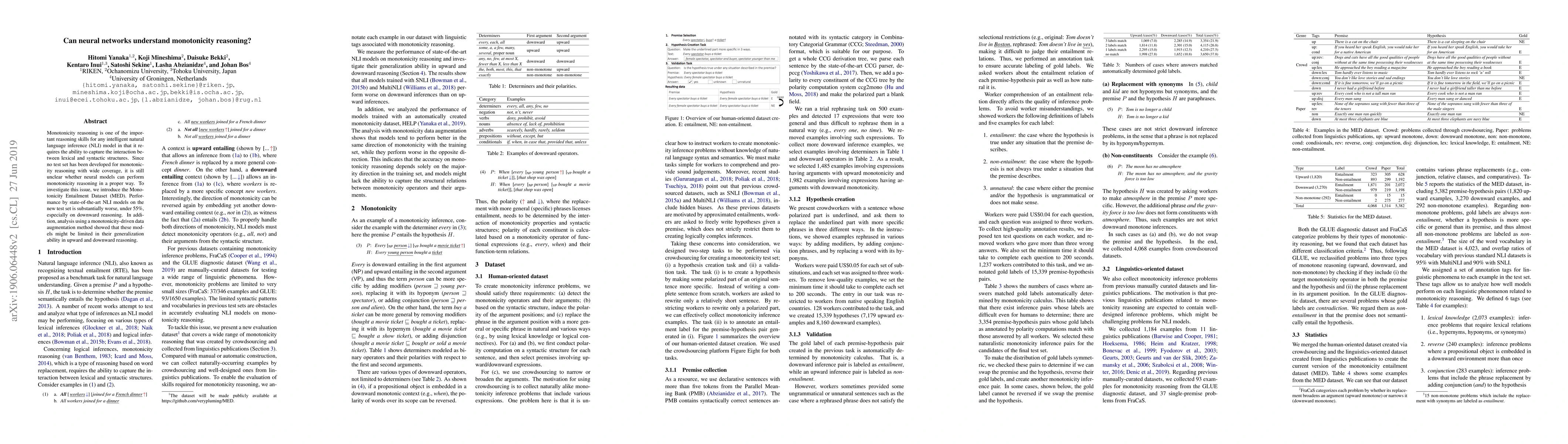 This study introduces the Monotonicity Entailment Dataset (MED) to evaluate neural networks' ability for monotonicity reasoning in natural language inference, finding that current models perform poorly, especially on downward reasoning, indicating limitations in their generalization capabilities.