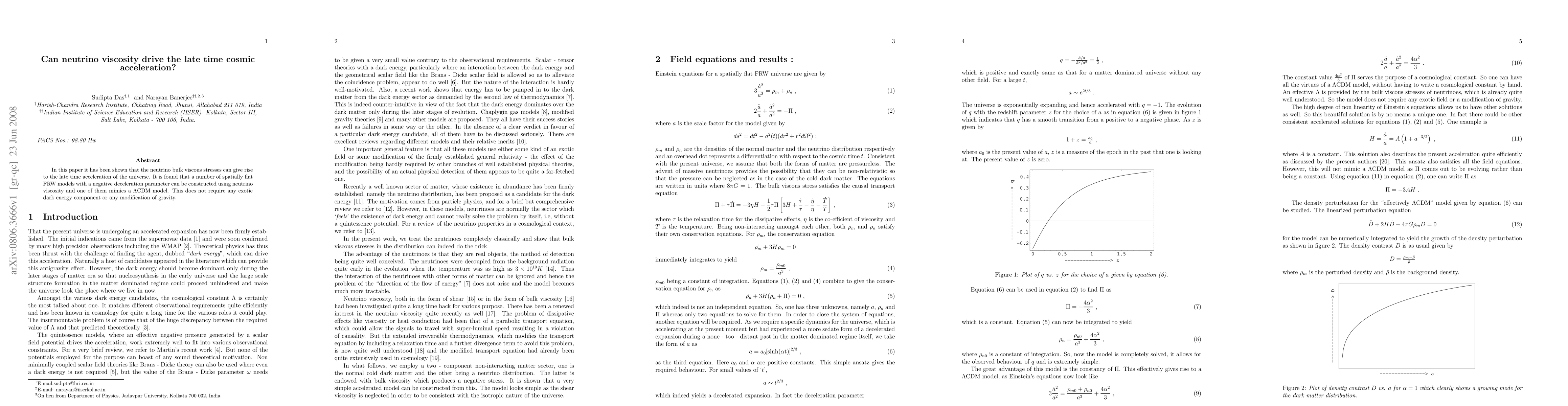 This paper demonstrates that neutrino bulk viscous stresses can drive the late-time acceleration of the universe, constructing several flat FRW models with negative deceleration parameters, one of which resembles a $\Lambda$CDM model without invoking dark energy or modifying gravity.