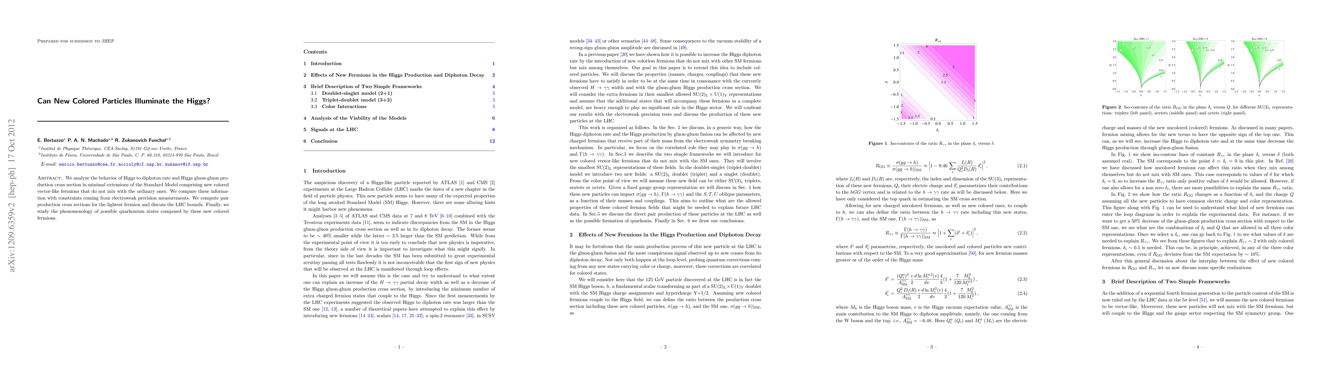 We analyze the behavior of Higgs to diphoton rate and Higgs gluon-gluon production cross section in minimal extensions of the Standard Model comprising new colored vector-like fermions that do not mix with the ordinary ones. We compare these information with constraints coming from electroweak precision measurements. We compute pair production cross sections for the lightest fermion and discuss the LHC bounds. Finally, we study the phenomenology of possible quarkonium states composed by these new colored fermions.