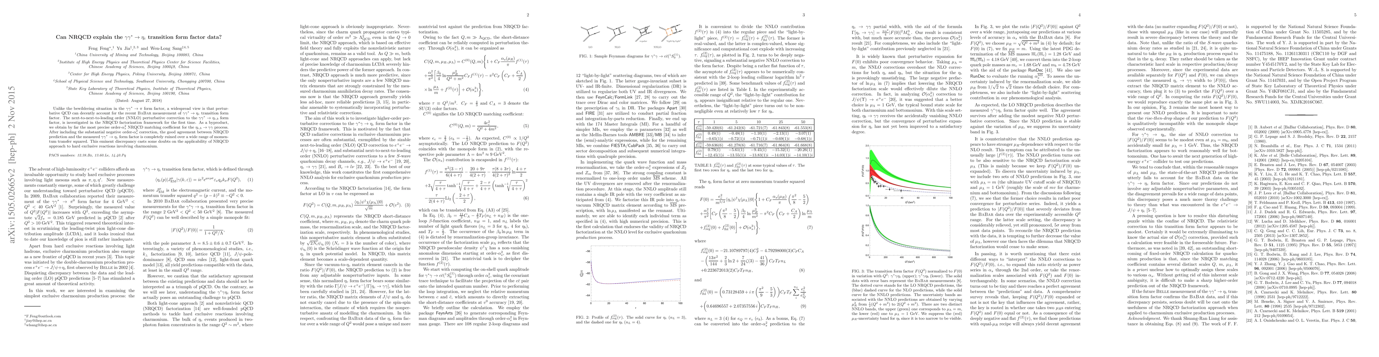 Unlike the bewildering situation in the $\gamma\gamma^*\to \pi$ form factor, a widespread view is that perturbative QCD can decently account for the recent \textsc{BaBar} measurement of $\gamma\gamma^*\to \eta_c$ transition form factor. The next-to-next-to-leading order (NNLO) perturbative correction to the $\gamma\gamma^*\to \eta_{c,b}$ form factor, is investigated in the NRQCD factorization framework for the first time. As a byproduct, we obtain by far the most precise order-$\alpha_s^2$ NRQCD matching coefficient for the $\eta_{c,b}\to \gamma\gamma$ process. After including the substantial negative order-$\alpha_s^2$ correction, the good agreement between NRQCD prediction and the measured $\gamma\gamma^*\to \eta_c$ form factor is completely ruined over a wide range of momentum transfer squared. This eminent discrepancy casts some doubts on the applicability of NRQCD approach to hard exclusive reactions involving charmonium.