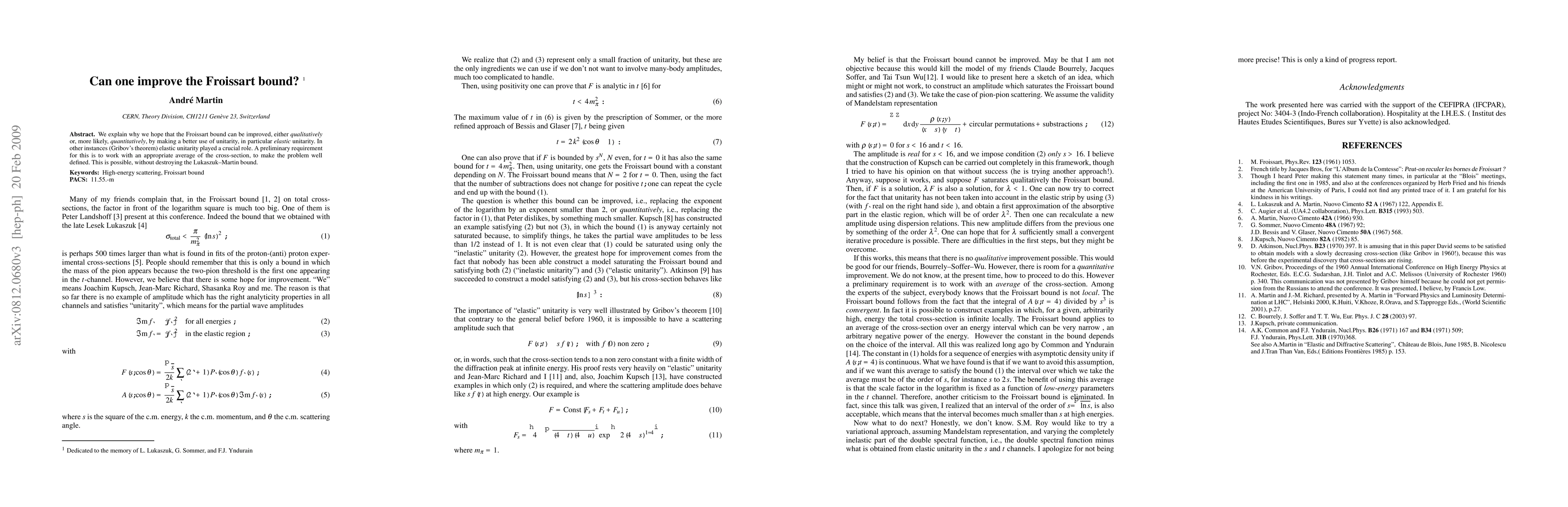 The paper explores the potential for improving the Froissart bound, either qualitatively or quantitatively, by leveraging elastic unitarity. It suggests that a well-defined average of the cross-section is necessary to achieve this without violating the Lukaszuk--Martin bound.