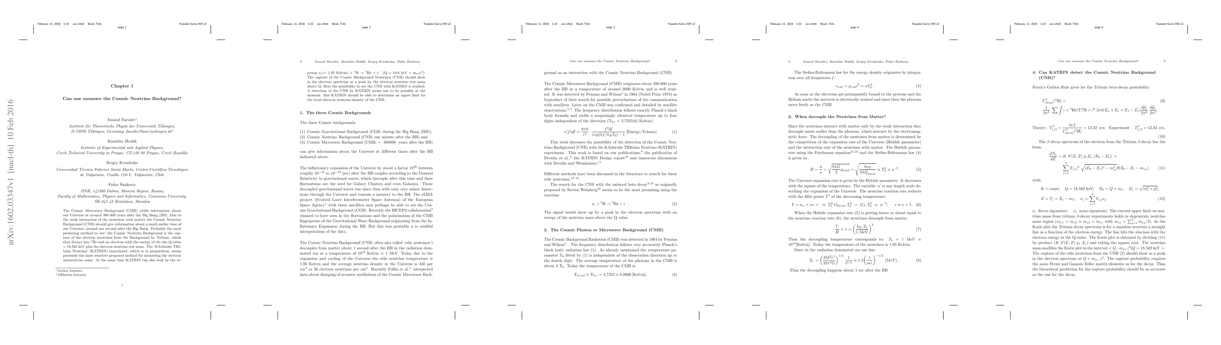 The paper explores the feasibility of detecting the Cosmic Neutrino Background (CNB) using the KATRIN experiment, which aims to capture electron neutrinos from the CNB via Tritium decay. While current capabilities suggest that direct detection of the CNB is not feasible, KATRIN could establish an upper limit for the local electron neutrino density of the CNB.