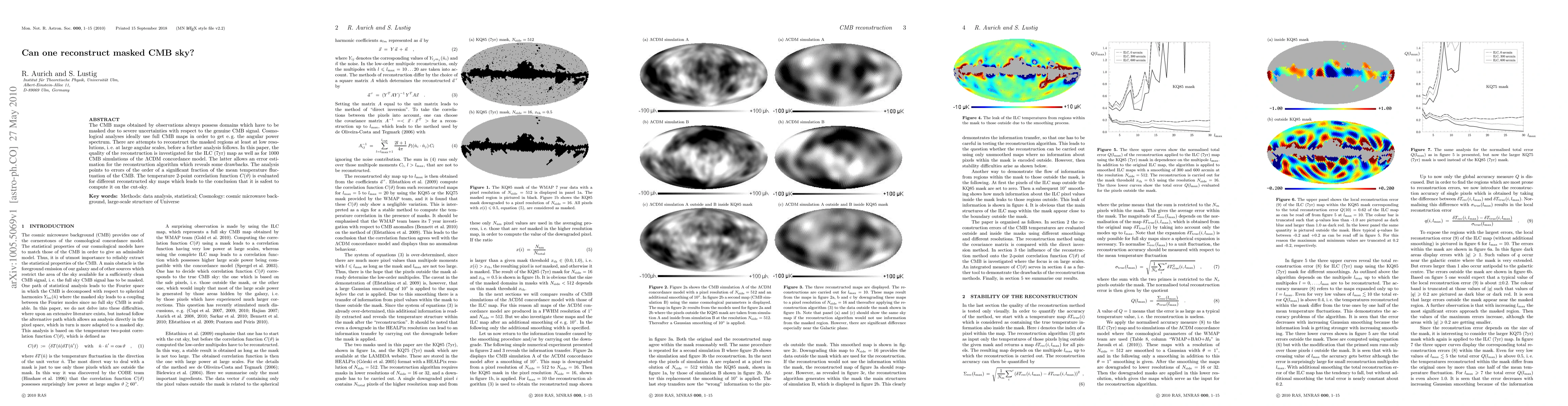 The CMB maps obtained by observations always possess domains which have to be masked due to severe uncertainties with respect to the genuine CMB signal. Cosmological analyses ideally use full CMB maps in order to get e.g. the angular power spectrum. There are attempts to reconstruct the masked regions at least at low resolutions, i.e. at large angular scales, before a further analysis follows. In this paper, the quality of the reconstruction is investigated for the ILC (7yr) map as well as for 1000 CMB simulations of the LambdaCDM concordance model. The latter allows an error estimation for the reconstruction algorithm which reveals some drawbacks. The analysis points to errors of the order of a significant fraction of the mean temperature fluctuation of the CMB. The temperature 2-point correlation function C(theta) is evaluated for different reconstructed sky maps which leads to the conclusion that it is safest to compute it on the cut-sky.