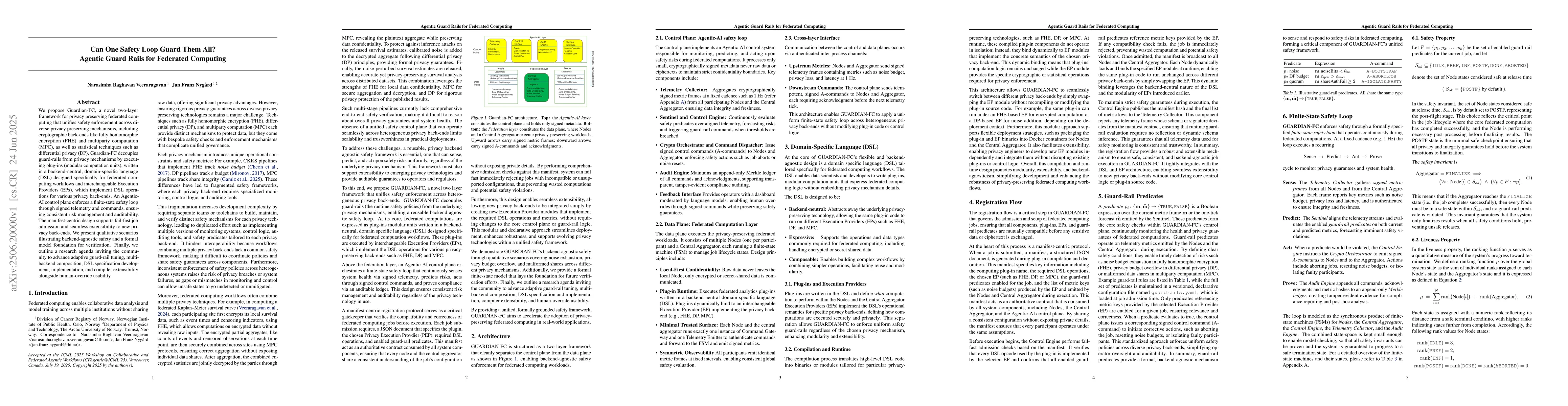We propose Guardian-FC, a novel two-layer framework for privacy preserving federated computing that unifies safety enforcement across diverse privacy preserving mechanisms, including cryptographic back-ends like fully homomorphic encryption (FHE) and multiparty computation (MPC), as well as statistical techniques such as differential privacy (DP). Guardian-FC decouples guard-rails from privacy mechanisms by executing plug-ins (modular computation units), written in a backend-neutral, domain-specific language (DSL) designed specifically for federated computing workflows and interchangeable Execution Providers (EPs), which implement DSL operations for various privacy back-ends. An Agentic-AI control plane enforces a finite-state safety loop through signed telemetry and commands, ensuring consistent risk management and auditability. The manifest-centric design supports fail-fast job admission and seamless extensibility to new privacy back-ends. We present qualitative scenarios illustrating backend-agnostic safety and a formal model foundation for verification. Finally, we outline a research agenda inviting the community to advance adaptive guard-rail tuning, multi-backend composition, DSL specification development, implementation, and compiler extensibility alongside human-override usability.