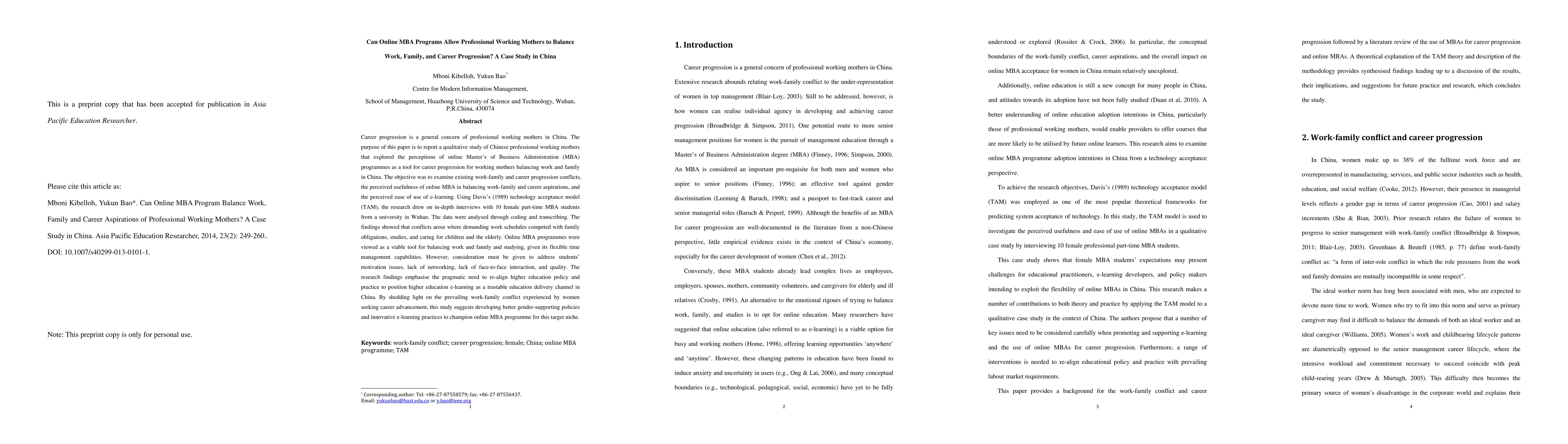 This paper explores how online MBA programs help Chinese working mothers balance work, family, and career progression, revealing that while these programs offer flexible time management, challenges remain regarding motivation, networking, and quality. The study calls for better gender-supportive policies and improved e-learning practices to enhance online MBA's effectiveness for this demographic.