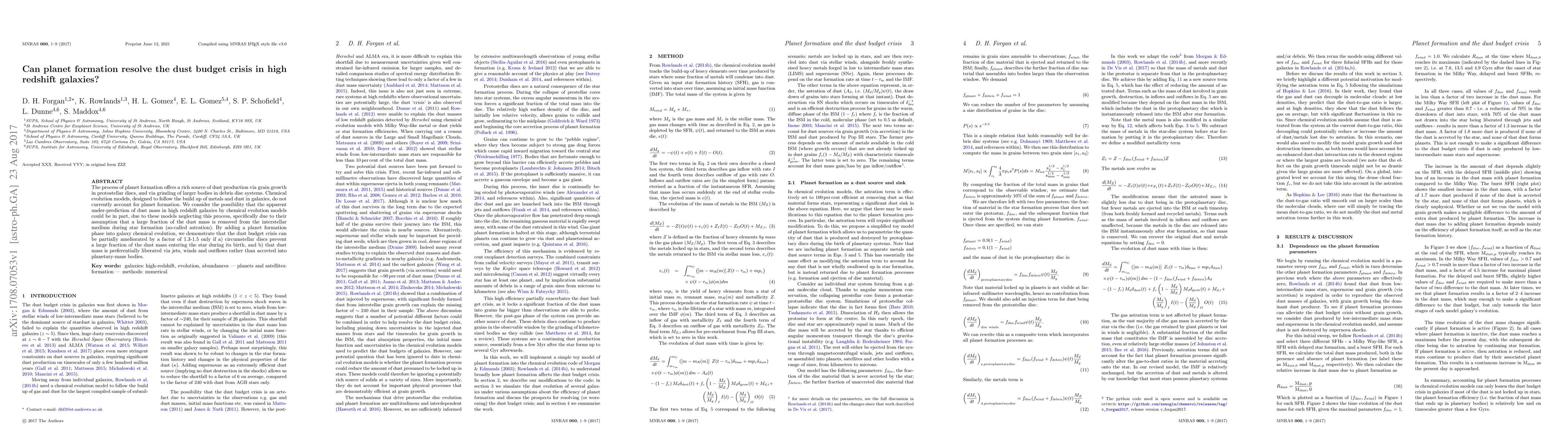 The paper explores whether planet formation can help resolve the dust budget crisis in high redshift galaxies, suggesting that chemical evolution models may under-predict dust due to neglecting planet formation processes. The inclusion of planet formation in these models can only partially alleviate the crisis if significant dust is retained in protostellar discs and released via jets and outflows.