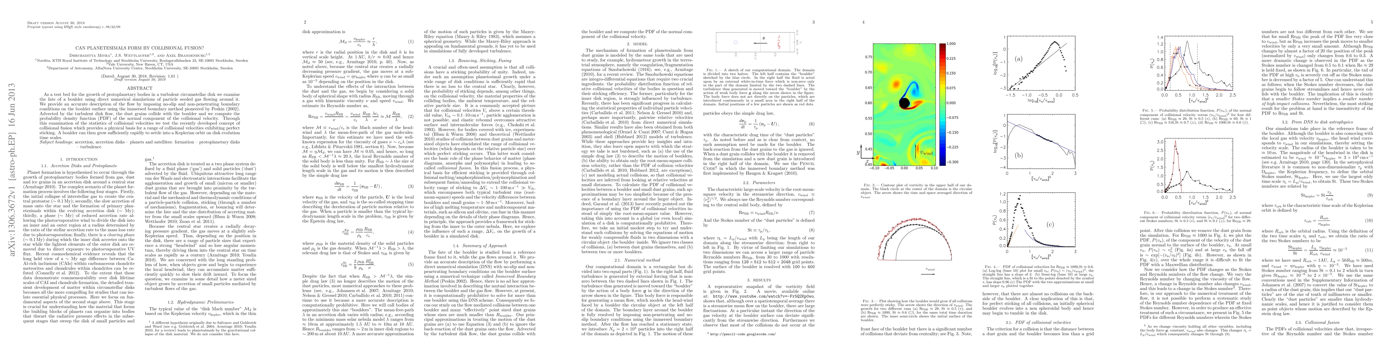 Researchers simulate collisions between dust grains and a boulder in a turbulent disk to test if planetesimals can form through collisional fusion, a process where perfect sticking occurs at certain velocities.
