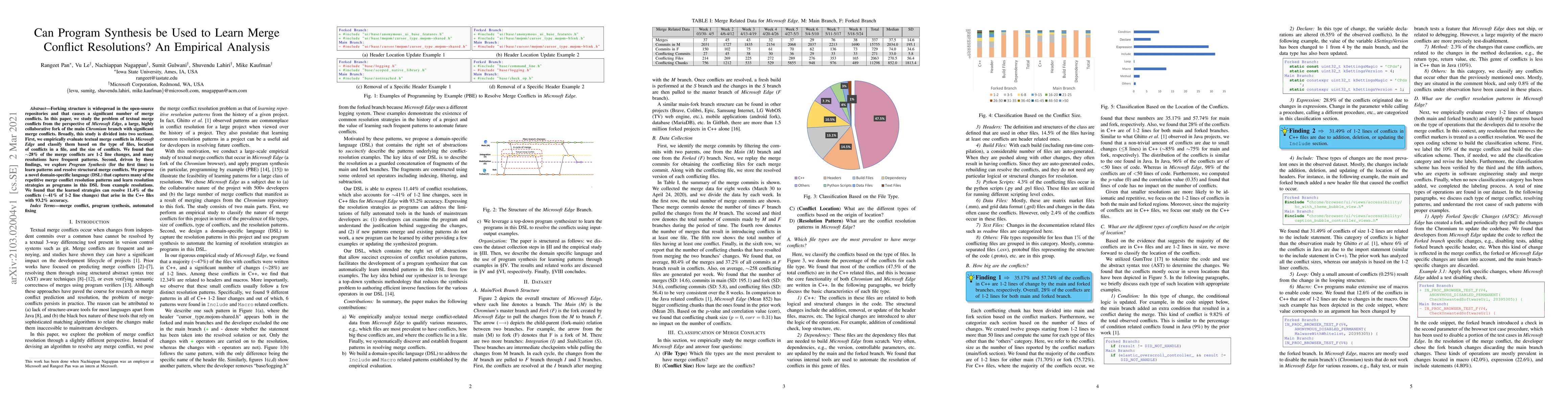 Forking structure is widespread in the open-source repositories and that causes a significant number of merge conflicts. In this paper, we study the problem of textual merge conflicts from the perspective of Microsoft Edge, a large, highly collaborative fork off the main Chromium branch with significant merge conflicts. Broadly, this study is divided into two sections. First, we empirically evaluate textual merge conflicts in Microsoft Edge and classify them based on the type of files, location of conflicts in a file, and the size of conflicts. We found that ~28% of the merge conflicts are 1-2 line changes, and many resolutions have frequent patterns. Second, driven by these findings, we explore Program Synthesis (for the first time) to learn patterns and resolve structural merge conflicts. We propose a novel domain-specific language (DSL) that captures many of the repetitive merge conflict resolution patterns and learn resolution strategies as programs in this DSL from example resolutions. We found that the learned strategies can resolve 11.4% of the conflicts (~41% of 1-2 line changes) that arise in the C++ files with 93.2% accuracy.