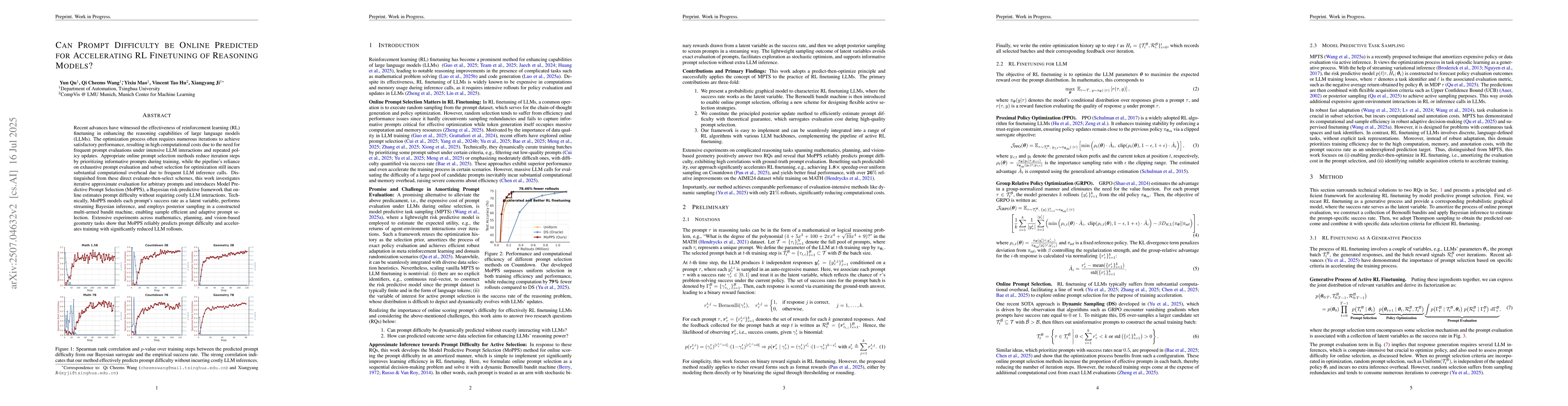 Recent advances have witnessed the effectiveness of reinforcement learning (RL) finetuning in enhancing the reasoning capabilities of large language models (LLMs). The optimization process often requires numerous iterations to achieve satisfactory performance, resulting in high computational costs due to the need for frequent prompt evaluations under intensive LLM interactions and repeated policy updates. Appropriate online prompt selection methods reduce iteration steps by prioritizing informative prompts during training, while the pipeline's reliance on exhaustive prompt evaluation and subset selection for optimization still incurs substantial computational overhead due to frequent LLM inference calls. Distinguished from these direct evaluate-then-select schemes, this work investigates iterative approximate evaluation for arbitrary prompts and introduces Model Predictive Prompt Selection (MoPPS), a Bayesian risk-predictive framework that online estimates prompt difficulty without requiring costly LLM interactions. Technically, MoPPS models each prompt's success rate as a latent variable, performs streaming Bayesian inference, and employs posterior sampling in a constructed multi-armed bandit machine, enabling sample efficient and adaptive prompt selection. Extensive experiments across mathematics, planning, and vision-based geometry tasks show that MoPPS reliably predicts prompt difficulty and accelerates training with significantly reduced LLM rollouts.