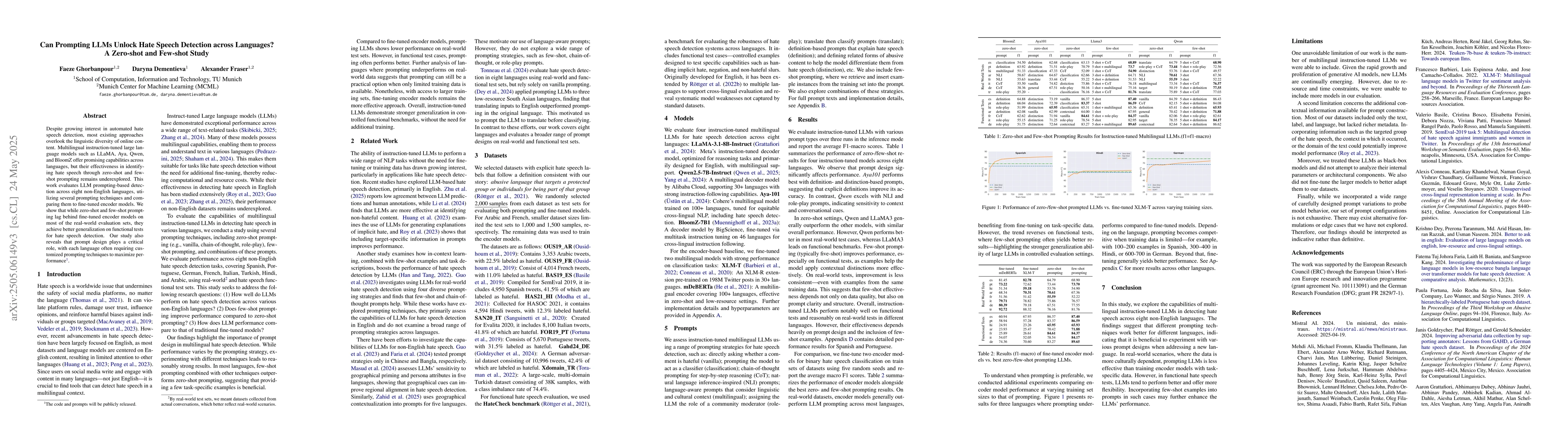The research evaluates LLM prompting-based hate speech detection across eight non-English languages, comparing various prompting techniques to fine-tuned encoder models through zero-shot and few-shot prompting.