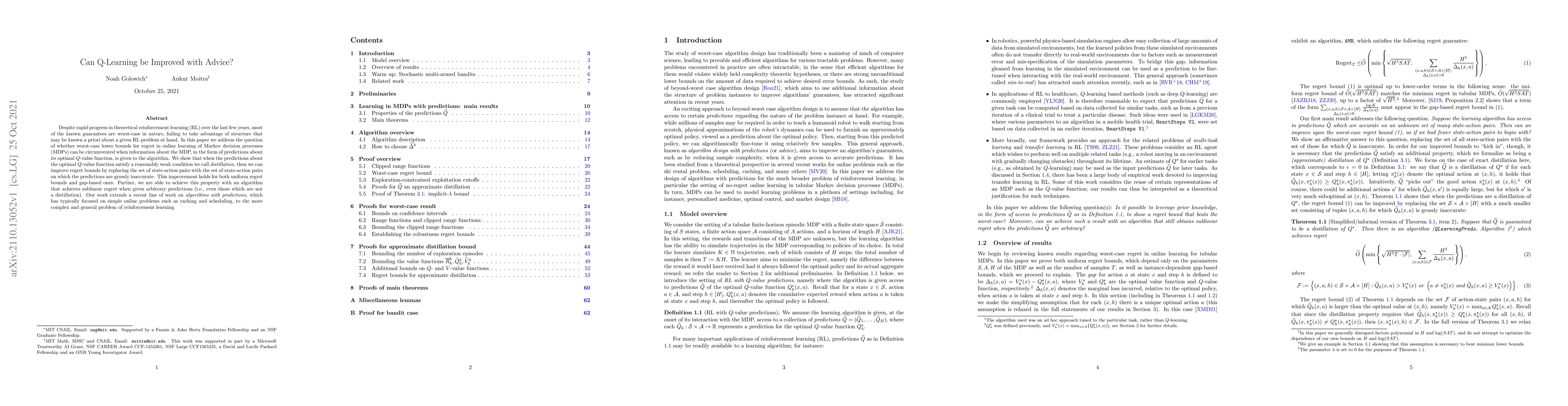 Despite rapid progress in theoretical reinforcement learning (RL) over the last few years, most of the known guarantees are worst-case in nature, failing to take advantage of structure that may be known a priori about a given RL problem at hand. In this paper we address the question of whether worst-case lower bounds for regret in online learning of Markov decision processes (MDPs) can be circumvented when information about the MDP, in the form of predictions about its optimal $Q$-value function, is given to the algorithm. We show that when the predictions about the optimal $Q$-value function satisfy a reasonably weak condition we call distillation, then we can improve regret bounds by replacing the set of state-action pairs with the set of state-action pairs on which the predictions are grossly inaccurate. This improvement holds for both uniform regret bounds and gap-based ones. Further, we are able to achieve this property with an algorithm that achieves sublinear regret when given arbitrary predictions (i.e., even those which are not a distillation). Our work extends a recent line of work on algorithms with predictions, which has typically focused on simple online problems such as caching and scheduling, to the more complex and general problem of reinforcement learning.