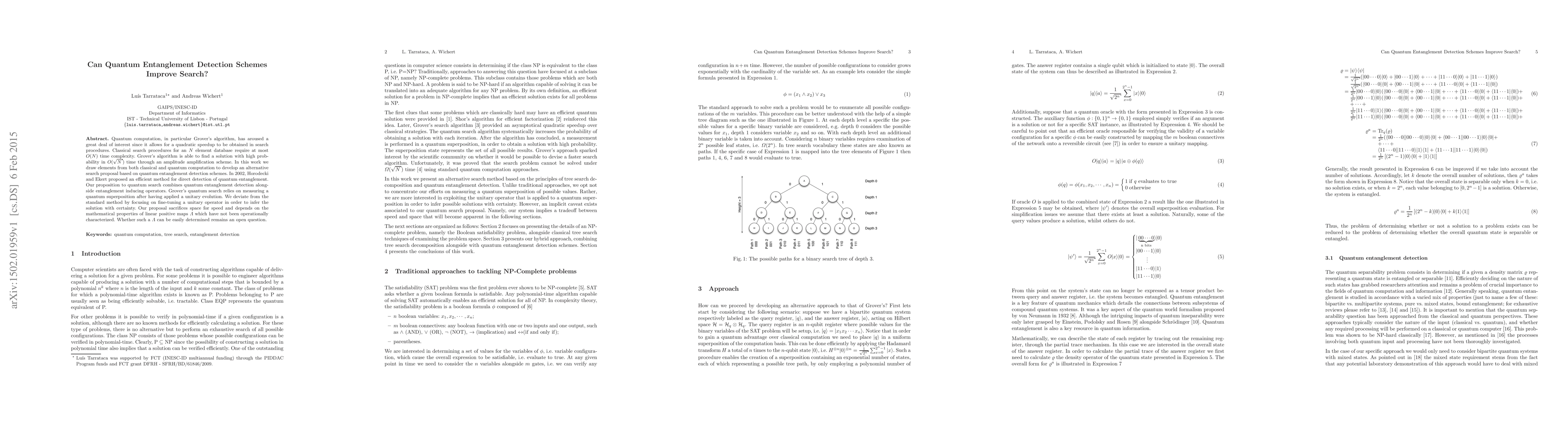 Quantum computation, in particular Grover's algorithm, has aroused a great deal of interest since it allows for a quadratic speedup to be obtained in search procedures. Classical search procedures for an $N$ element database require at most $O(N)$ time complexity. Grover's algorithm is able to find a solution with high probability in $O(\sqrt{N})$ time through an amplitude amplification scheme. In this work we draw elements from both classical and quantum computation to develop an alternative search proposal based on quantum entanglement detection schemes. In 2002, Horodecki and Ekert proposed an efficient method for direct detection of quantum entanglement. Our proposition to quantum search combines quantum entanglement detection alongside entanglement inducing operators. Grover's quantum search relies on measuring a quantum superposition after having applied a unitary evolution. We deviate from the standard method by focusing on fine-tuning a unitary operator in order to infer the solution with certainty. Our proposal sacrifices space for speed and depends on the mathematical properties of linear positive maps $\Lambda$ which have not been operationally characterized. Whether such a $\Lambda$ can be easily determined remains an open question.