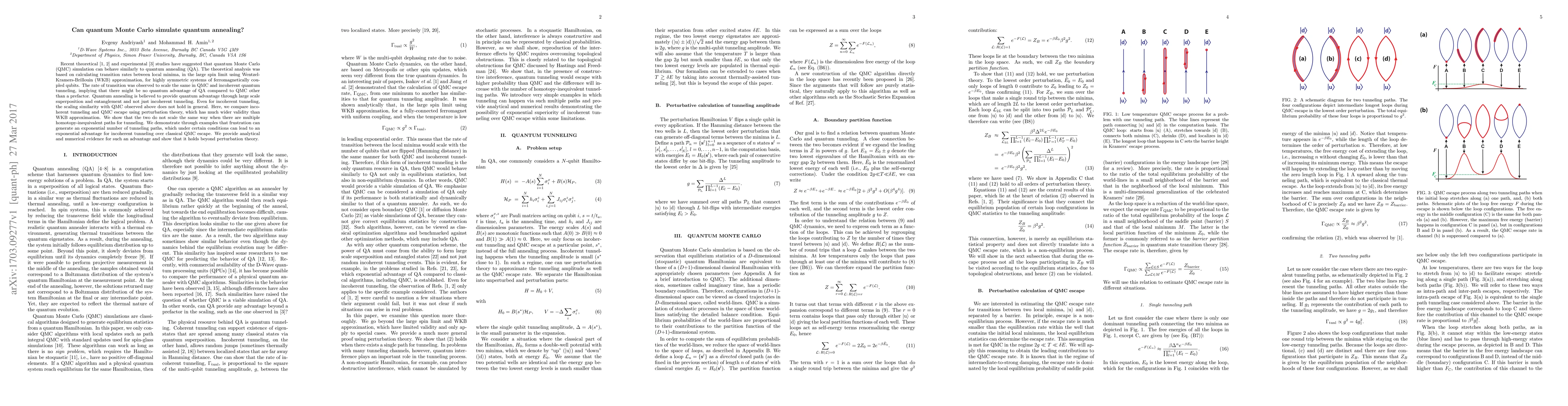 This paper investigates whether quantum Monte Carlo (QMC) simulations can replicate quantum annealing (QA) processes, finding that while both exhibit similar scaling for transition rates in certain conditions, QA can provide an exponential advantage over QMC in scenarios with multiple tunneling paths due to frustration.