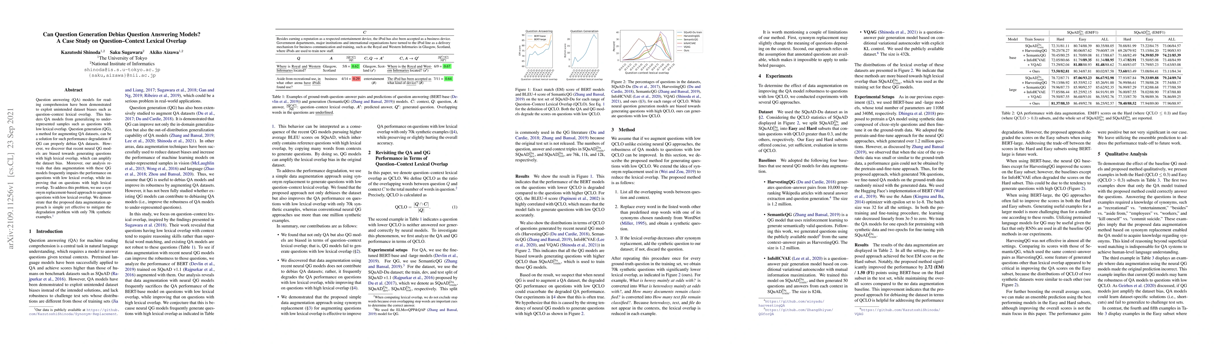 Question answering (QA) models for reading comprehension have been demonstrated to exploit unintended dataset biases such as question-context lexical overlap. This hinders QA models from generalizing to under-represented samples such as questions with low lexical overlap. Question generation (QG), a method for augmenting QA datasets, can be a solution for such performance degradation if QG can properly debias QA datasets. However, we discover that recent neural QG models are biased towards generating questions with high lexical overlap, which can amplify the dataset bias. Moreover, our analysis reveals that data augmentation with these QG models frequently impairs the performance on questions with low lexical overlap, while improving that on questions with high lexical overlap. To address this problem, we use a synonym replacement-based approach to augment questions with low lexical overlap. We demonstrate that the proposed data augmentation approach is simple yet effective to mitigate the degradation problem with only 70k synthetic examples. Our data is publicly available at https://github.com/KazutoshiShinoda/Synonym-Replacement.