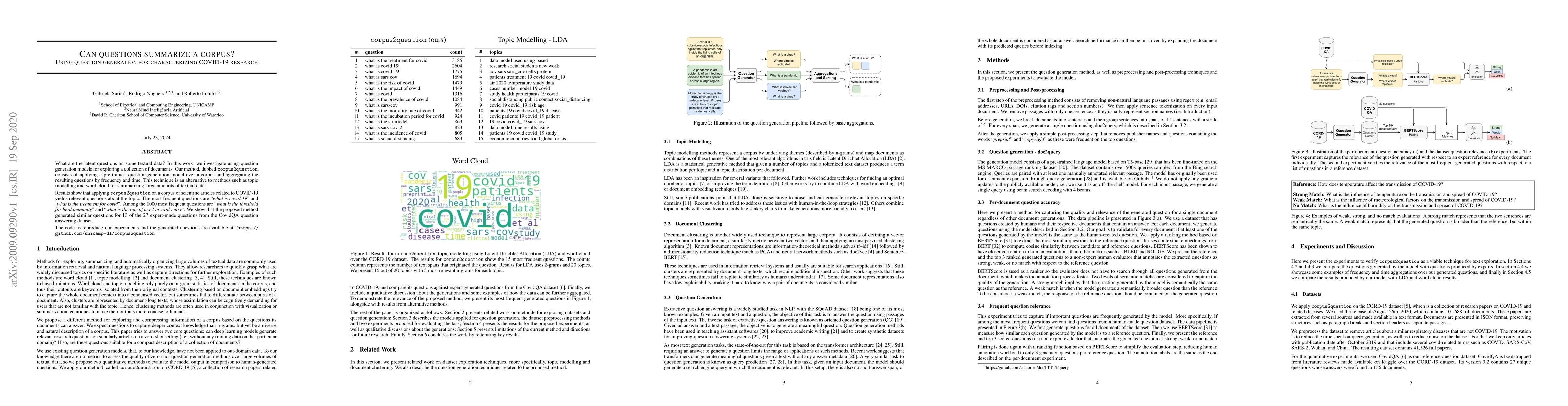 What are the latent questions on some textual data? In this work, we investigate using question generation models for exploring a collection of documents. Our method, dubbed corpus2question, consists of applying a pre-trained question generation model over a corpus and aggregating the resulting questions by frequency and time. This technique is an alternative to methods such as topic modelling and word cloud for summarizing large amounts of textual data. Results show that applying corpus2question on a corpus of scientific articles related to COVID-19 yields relevant questions about the topic. The most frequent questions are "what is covid 19" and "what is the treatment for covid". Among the 1000 most frequent questions are "what is the threshold for herd immunity" and "what is the role of ace2 in viral entry". We show that the proposed method generated similar questions for 13 of the 27 expert-made questions from the CovidQA question answering dataset. The code to reproduce our experiments and the generated questions are available at: https://github.com/unicamp-dl/corpus2question