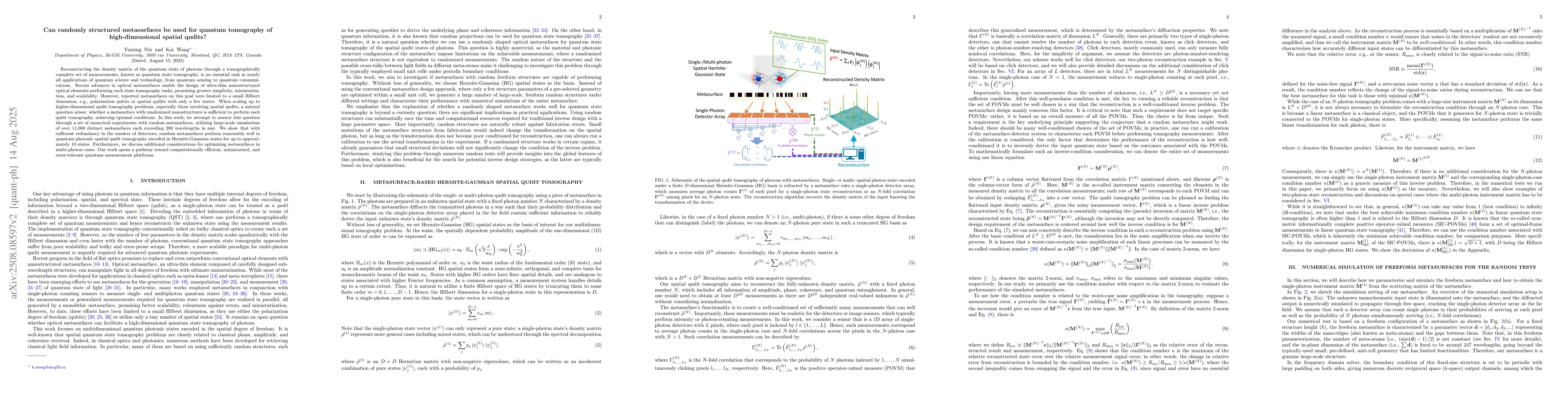 Reconstructing the density matrix of the quantum state of photons through a tomographically complete set of measurements, known as quantum state tomography, is an essential task in nearly all applications of quantum science and technology, from quantum sensing to quantum communications. Recent advances in optical metasurfaces enable the design of ultra-thin nanostructured optical elements performing such state tomography tasks, promising greater simplicity, miniaturization, and scalability. However, reported metasurfaces on this goal were limited to a small Hilbert dimension, e.g., polarization qubits or spatial qudits with only a few states. When scaling up to higher-dimensional qudit tomography problems, especially those involving spatial qudits, a natural question arises: whether a metasurface with randomized nanostructures is sufficient to perform such qudit tomography, achieving optimal conditions. In this work, we attempt to answer this question through a set of numerical experiments with random metasurfaces, utilizing large-scale simulations of over 11,000 distinct metasurfaces each exceeding 200 wavelengths in size. We show that with sufficient redundancy in the number of detectors, random metasurfaces perform reasonably well in quantum photonic spatial qudit tomography encoded in Hermite-Gaussian states for up to approximately 10 states. Furthermore, we discuss additional considerations for optimizing metasurfaces in multi-photon cases. Our work opens a pathway toward computationally efficient, miniaturized, and error-tolerant quantum measurement platforms.