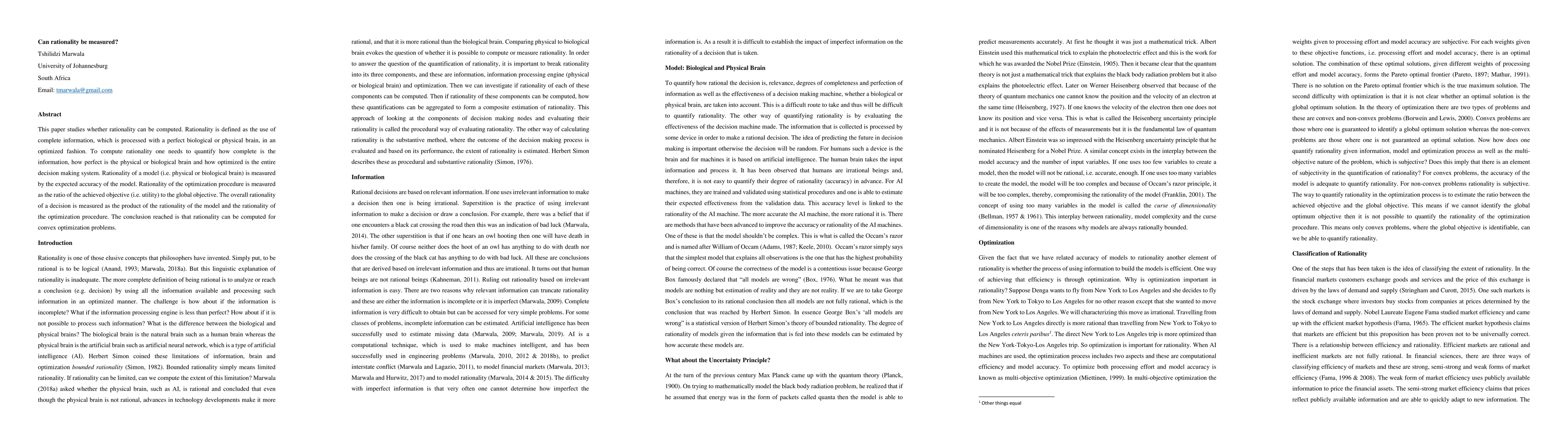 This paper studies whether rationality can be computed. Rationality is defined as the use of complete information, which is processed with a perfect biological or physical brain, in an optimized fashion. To compute rationality one needs to quantify how complete is the information, how perfect is the physical or biological brain and how optimized is the entire decision making system. The rationality of a model (i.e. physical or biological brain) is measured by the expected accuracy of the model. The rationality of the optimization procedure is measured as the ratio of the achieved objective (i.e. utility) to the global objective. The overall rationality of a decision is measured as the product of the rationality of the model and the rationality of the optimization procedure. The conclusion reached is that rationality can be computed for convex optimization problems.