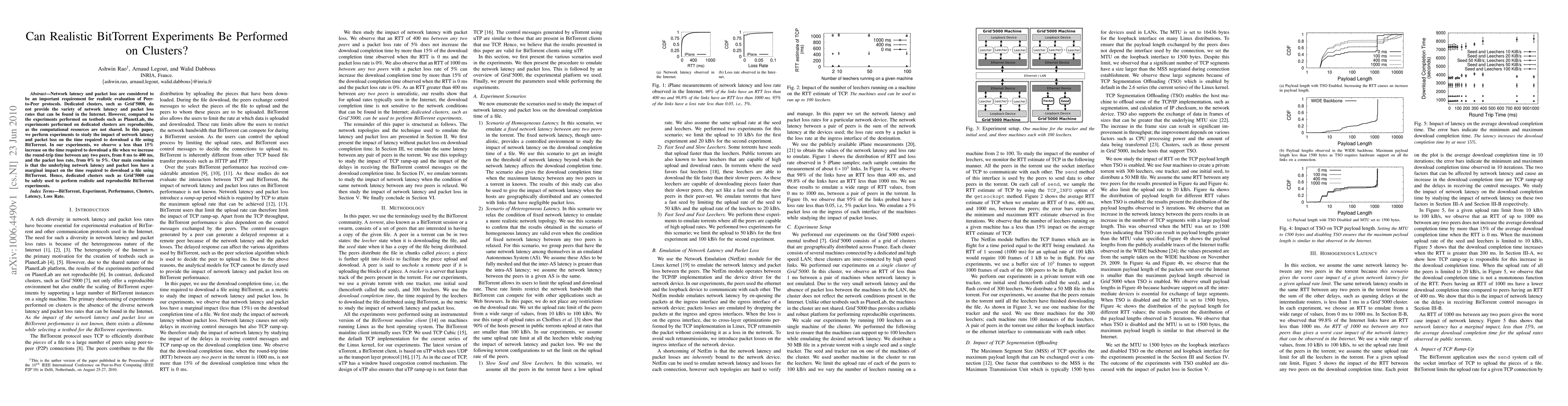 Network latency and packet loss are considered to be an important requirement for realistic evaluation of Peer-to-Peer protocols. Dedicated clusters, such as Grid'5000, do not provide the variety of network latency and packet loss rates that can be found in the Internet. However, compared to the experiments performed on testbeds such as PlanetLab, the experiments performed on dedicated clusters are reproducible, as the computational resources are not shared. In this paper, we perform experiments to study the impact of network latency and packet loss on the time required to download a file using BitTorrent. In our experiments, we observe a less than 15% increase on the time required to download a file when we increase the round-trip time between any two peers, from 0 ms to 400 ms, and the packet loss rate, from 0% to 5%. Our main conclusion is that the underlying network latency and packet loss have a marginal impact on the time required to download a file using BitTorrent. Hence, dedicated clusters such as Grid'5000 can be safely used to perform realistic and reproducible BitTorrent experiments.