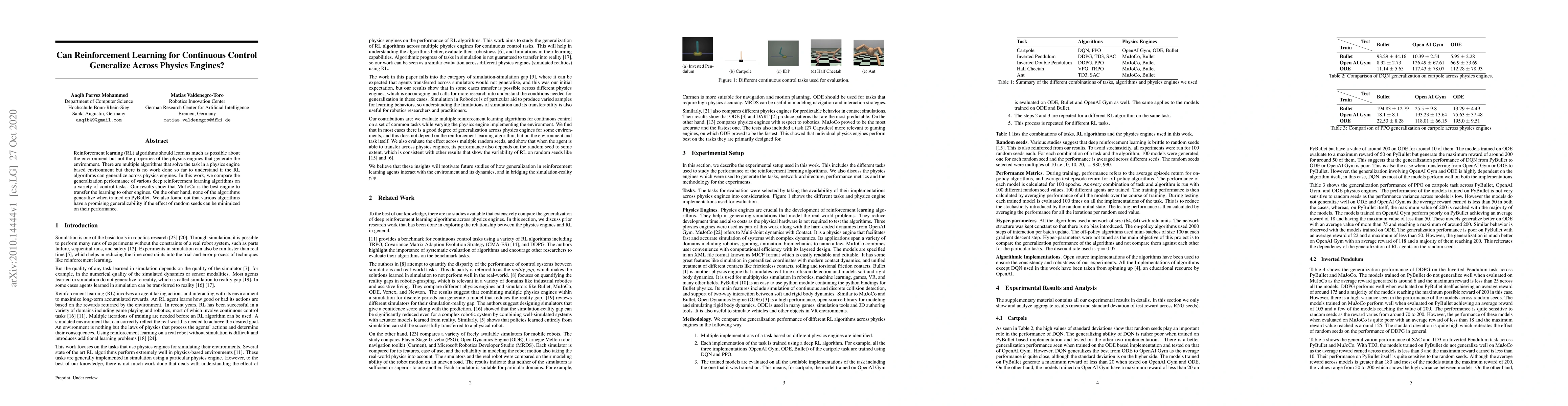 This paper investigates whether reinforcement learning algorithms trained in one physics engine can generalize to others. The study finds that while MuJoCo-trained algorithms show good transferability, those trained on PyBullet do not generalize, and minimizing the effect of random seeds enhances generalizability across engines.