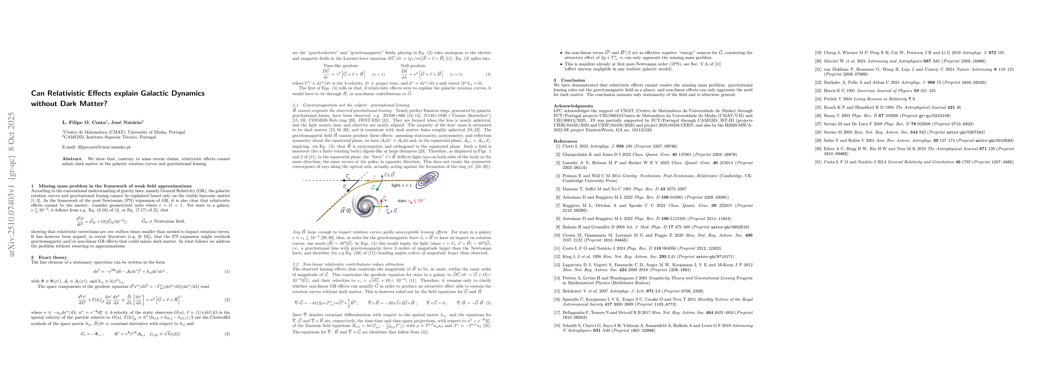 The paper uses a combination of exact general relativity equations and post-Newtonian approximations to analyze whether relativistic effects can explain galactic dynamics without dark matter, focusing on rotation curves and gravitational lensing.
