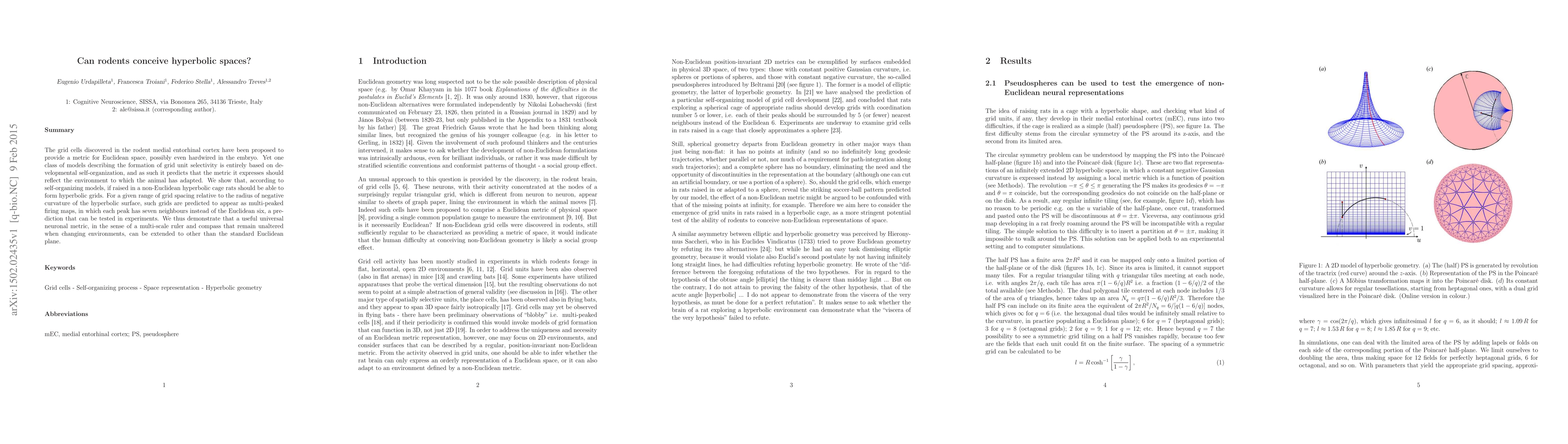 The grid cells discovered in the rodent medial entorhinal cortex have been proposed to provide a metric for Euclidean space, possibly even hardwired in the embryo. Yet one class of models describing the formation of grid unit selectivity is entirely based on developmental self-organization, and as such it predicts that the metric it expresses should reflect the environment to which the animal has adapted. We show that, according to self-organizing models, if raised in a non-Euclidean hyperbolic cage rats should be able to form hyperbolic grids. For a given range of grid spacing relative to the radius of negative curvature of the hyperbolic surface, such grids are predicted to appear as multi-peaked firing maps, in which each peak has seven neighbours instead of the Euclidean six, a prediction that can be tested in experiments. We thus demonstrate that a useful universal neuronal metric, in the sense of a multi-scale ruler and compass that remain unaltered when changing environments, can be extended to other than the standard Euclidean plane.