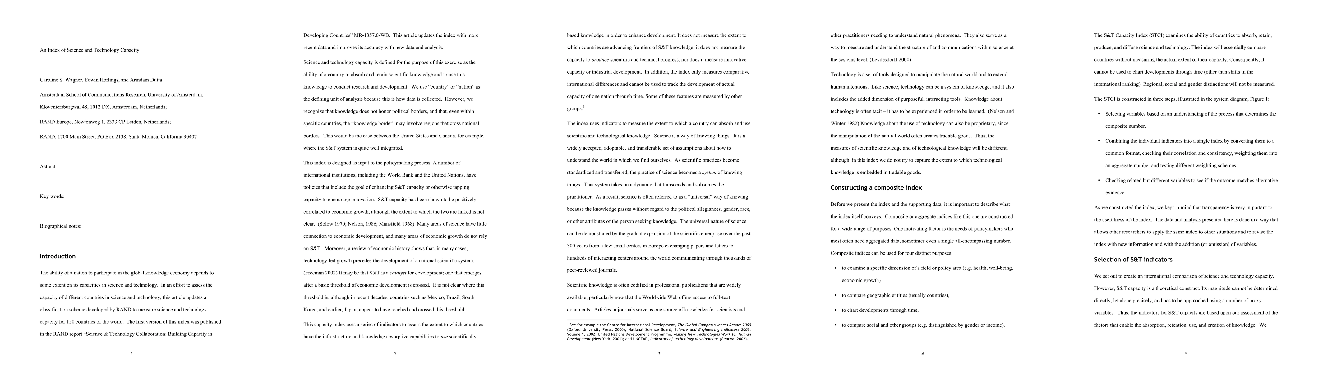 The ability of a nation to participate in the global knowledge economy depends to some extent on its capacities in science and technology. In an effort to assess the capacity of different countries in science and technology, this article updates a classification scheme developed by RAND to measure science and technology capacity for 150 countries of the world.