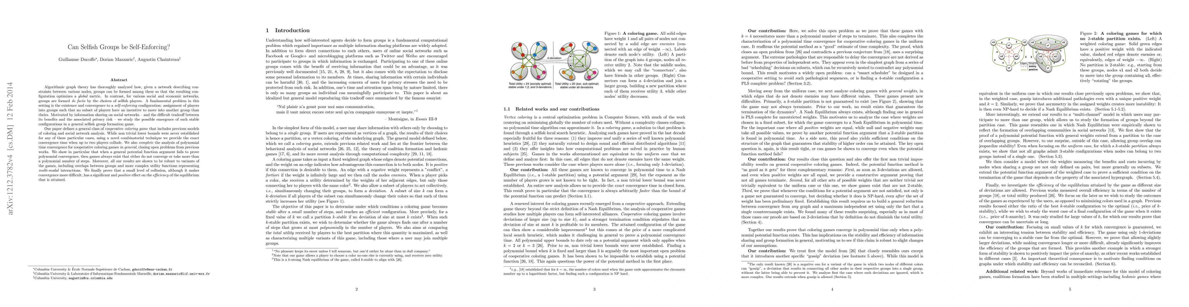 Algorithmic graph theory has thoroughly analyzed how, given a network describing constraints between various nodes, groups can be formed among these so that the resulting configuration optimizes a \emph{global} metric. In contrast, for various social and economic networks, groups are formed \emph{de facto} by the choices of selfish players. A fundamental problem in this setting is the existence and convergence to a \emph{self-enforcing} configuration: assignment of players into groups such that no player has an incentive to move into another group than hers. Motivated by information sharing on social networks -- and the difficult tradeoff between its benefits and the associated privacy risk -- we study the possible emergence of such stable configurations in a general selfish group formation game. Our paper considers this general game for the first time, and it completes its analysis. We show that convergence critically depends on the level of \emph{collusions} among the players -- which allow multiple players to move simultaneously as long as \emph{all of them} benefit. Solving a previously open problem we exactly show when, depending on collusions, convergence occurs within polynomial time, non-polynomial time, and when it never occurs. We also prove that previously known bounds on convergence time are all loose: by a novel combinatorial analysis of the evolution of this game we are able to provide the first \emph{asymptotically exact} formula on its convergence. Moreover, we extend these results by providing a complete analysis when groups may \emph{overlap}, and for general utility functions representing \emph{multi-modal} interactions. Finally, we prove that collusions have a significant and \emph{positive} effect on the \emph{efficiency} of the equilibrium that is attained.
