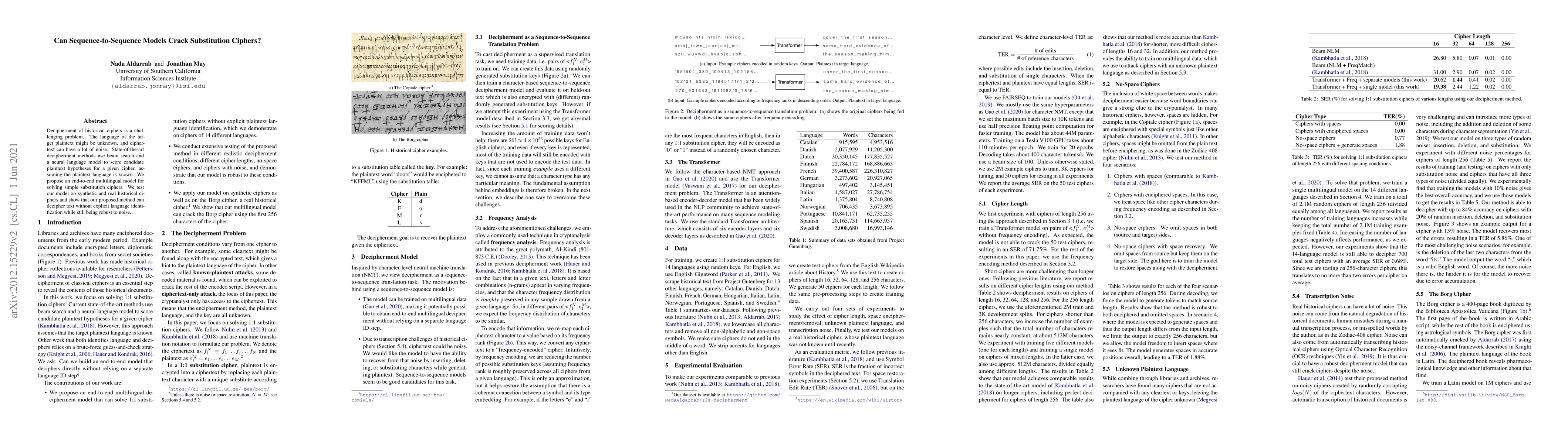 This paper proposes an end-to-end multilingual sequence-to-sequence model to decipher simple substitution ciphers without requiring prior knowledge of the plaintext language. The model demonstrates robustness to noise and successfully deciphers both synthetic and real historical ciphers.