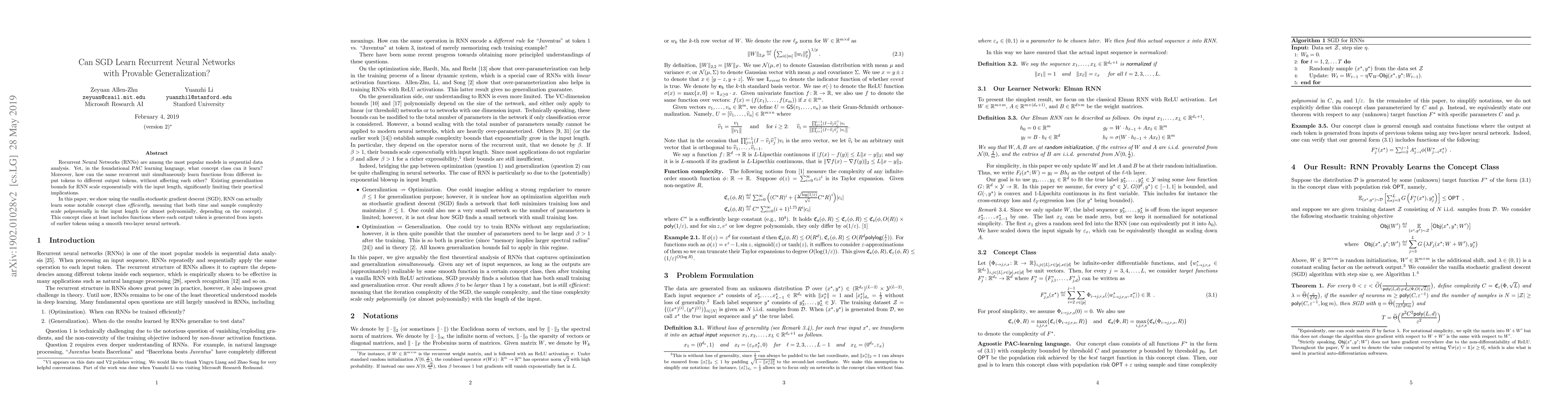 This paper demonstrates that vanilla stochastic gradient descent (SGD) can enable Recurrent Neural Networks (RNNs) to learn certain concept classes efficiently, with time and sample complexity scaling polynomially in input length, addressing existing exponential scaling limitations. The concept class includes functions where outputs are generated from earlier inputs using a smooth two-layer neural network.
