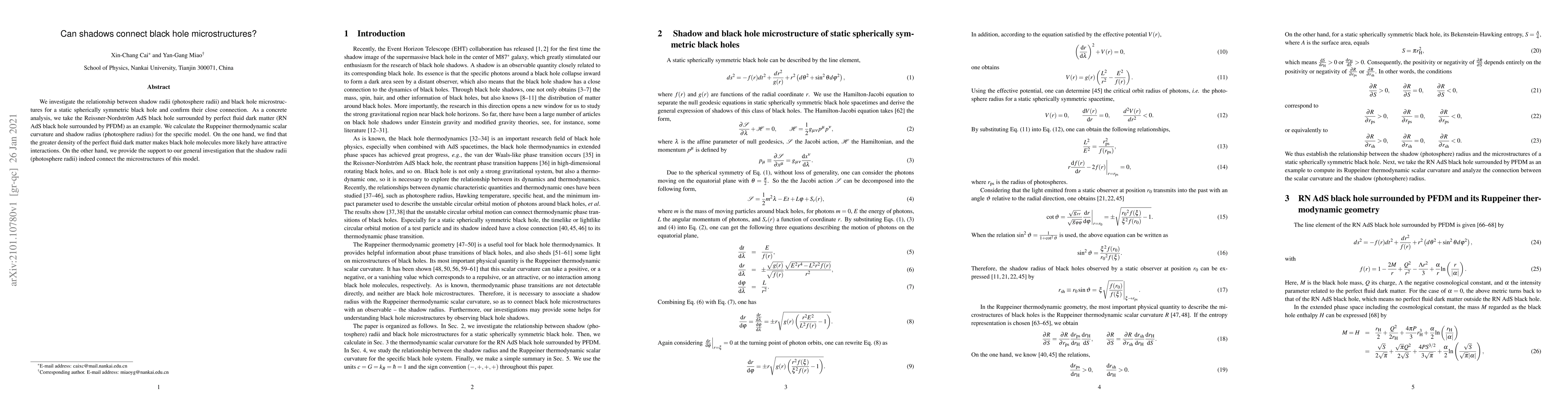 We investigate the relationship between shadow radii (photosphere radii) and black hole microstructures for a static spherically symmetric black hole and confirm their close connection. As a concrete analysis, we take the Reissner-Nordstr$\mathrm{\ddot{o}}$m AdS black hole surrounded by perfect fluid dark matter (RN AdS black hole surrounded by PFDM) as an example. We calculate the Ruppeiner thermodynamic scalar curvature and shadow radius (photosphere radius) for the specific model. On the one hand, we find that the greater density of the perfect fluid dark matter makes black hole molecules more likely have attractive interactions. On the other hand, we provide the support to our general investigation that the shadow radii (photosphere radii) indeed connect the microstructures of this model.
