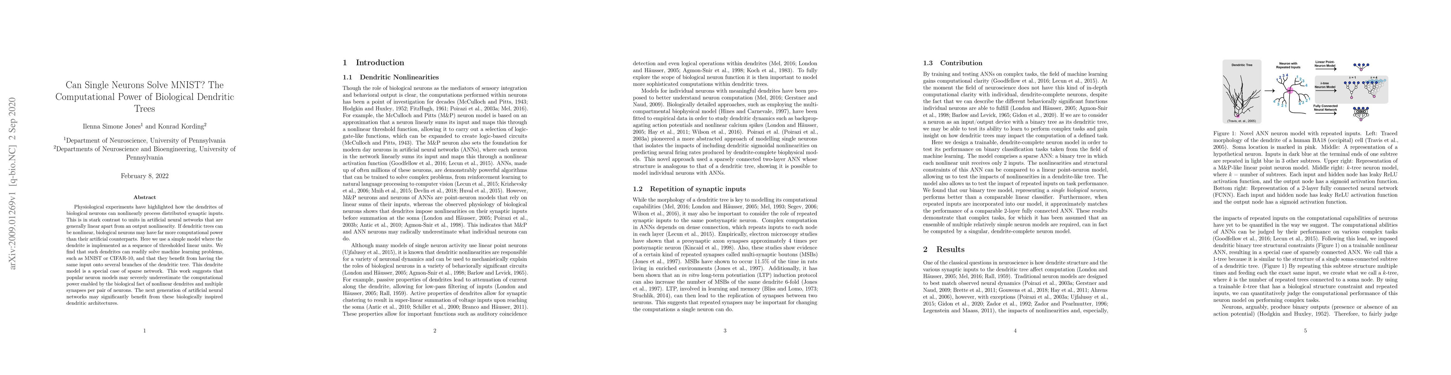 This paper investigates whether a simplified model of biological dendritic trees can solve machine learning tasks like MNIST, finding they outperform standard artificial neural networks. It suggests that biological dendrites, with their nonlinear processing capabilities, may offer more computational power than current artificial models, indicating potential for future neural network designs inspired by biology.
