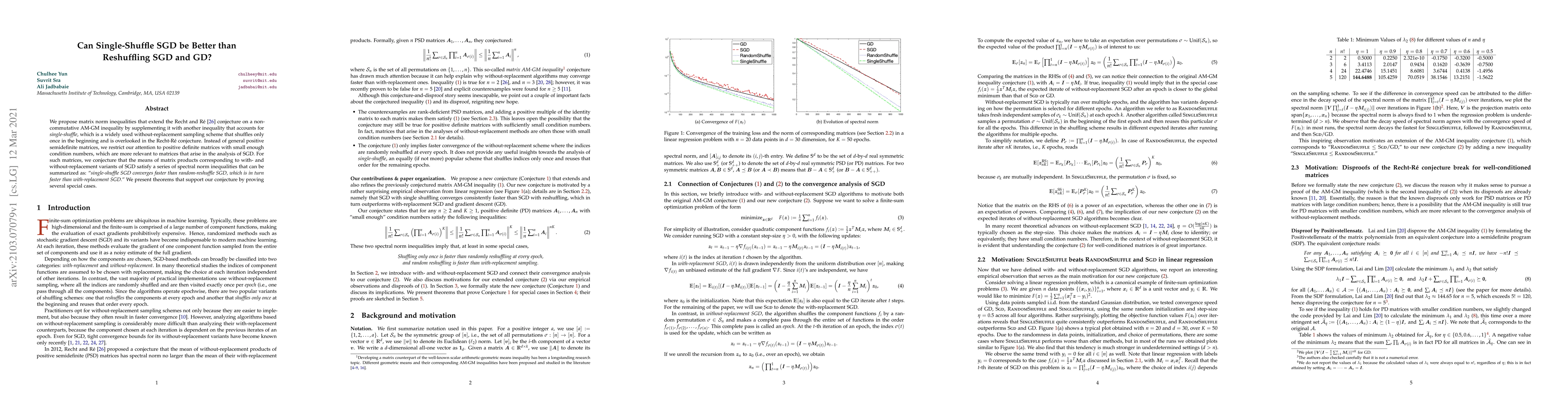 We propose matrix norm inequalities that extend the Recht-R\'e (2012) conjecture on a noncommutative AM-GM inequality by supplementing it with another inequality that accounts for single-shuffle, which is a widely used without-replacement sampling scheme that shuffles only once in the beginning and is overlooked in the Recht-R\'e conjecture. Instead of general positive semidefinite matrices, we restrict our attention to positive definite matrices with small enough condition numbers, which are more relevant to matrices that arise in the analysis of SGD. For such matrices, we conjecture that the means of matrix products corresponding to with- and without-replacement variants of SGD satisfy a series of spectral norm inequalities that can be summarized as: "single-shuffle SGD converges faster than random-reshuffle SGD, which is in turn faster than with-replacement SGD." We present theorems that support our conjecture by proving several special cases.
