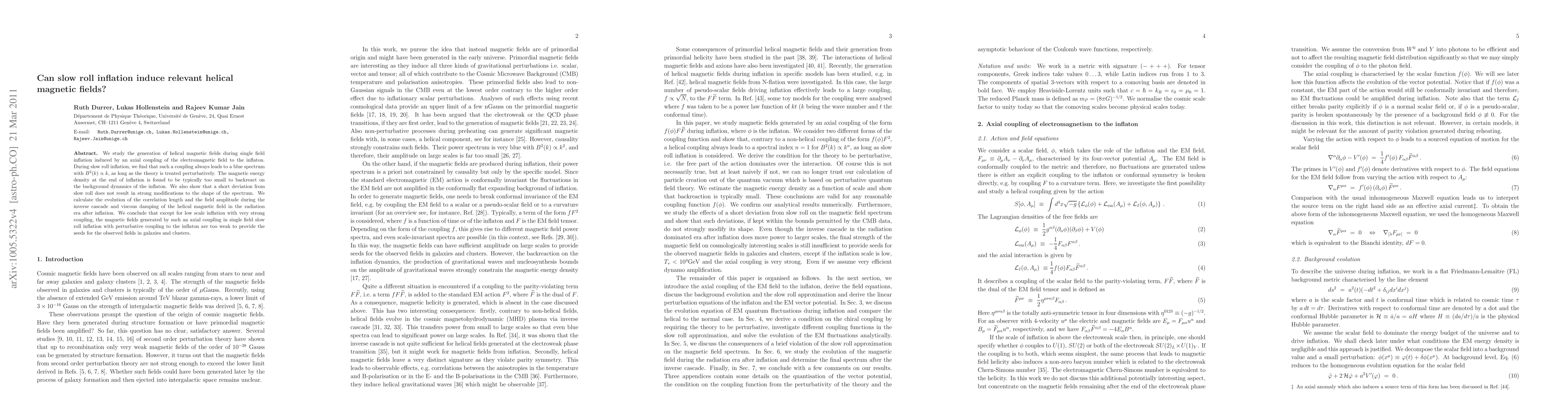 This paper explores the generation of helical magnetic fields during slow roll inflation through an axial coupling to the inflaton, finding a blue spectrum but weak magnetic energy density. It concludes that such fields are unlikely to seed the observed magnetic fields in galaxies and clusters, except in low scale inflation with strong coupling.