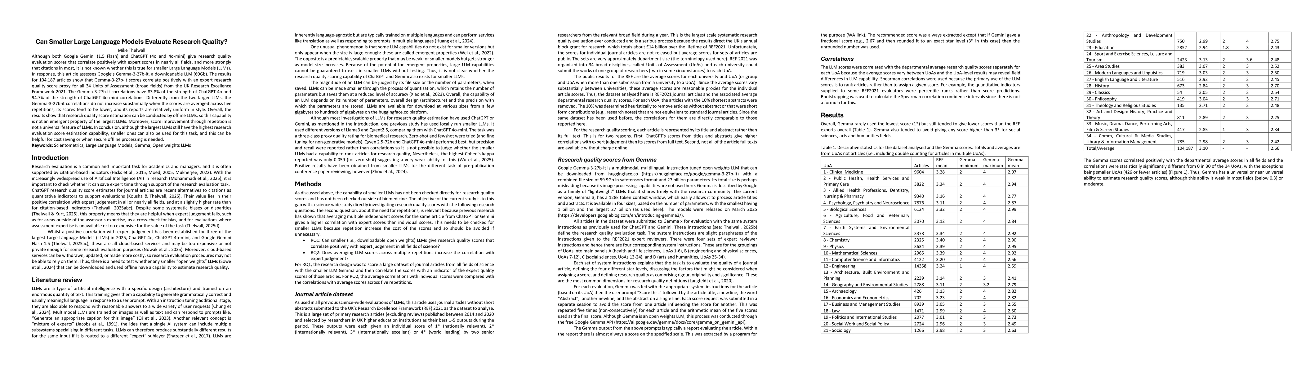 The study evaluates the research quality estimation capability of Google's Gemma-3-27b-it, a downloadable LLM (60Gb), against expert scores and citations using 104,187 articles from various Units of Assessment (UoAs).