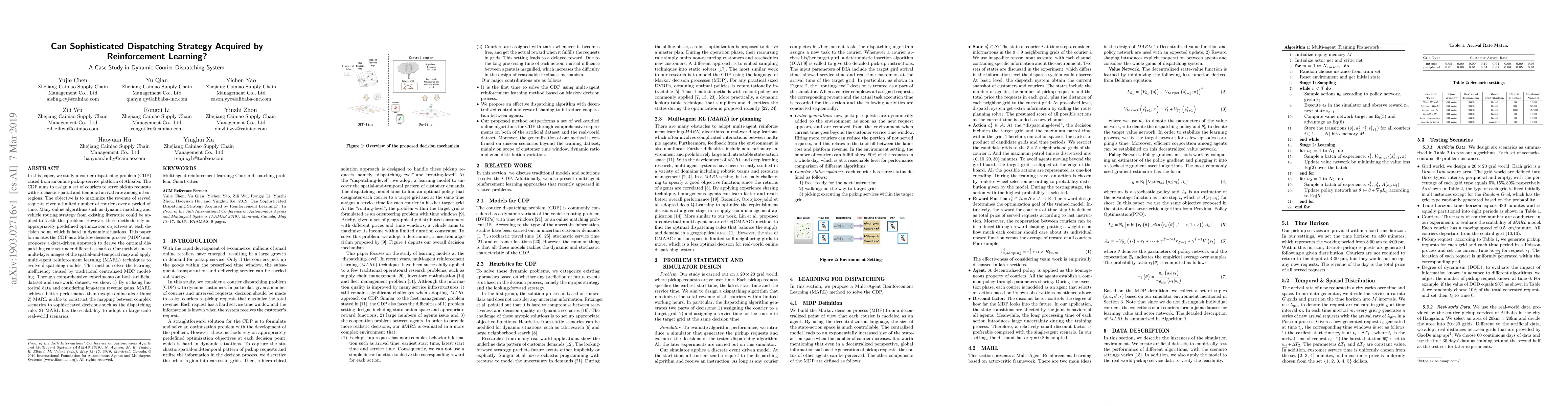 In this paper, we study a courier dispatching problem (CDP) raised from an online pickup-service platform of Alibaba. The CDP aims to assign a set of couriers to serve pickup requests with stochastic spatial and temporal arrival rate among urban regions. The objective is to maximize the revenue of served requests given a limited number of couriers over a period of time. Many online algorithms such as dynamic matching and vehicle routing strategy from existing literature could be applied to tackle this problem. However, these methods rely on appropriately predefined optimization objectives at each decision point, which is hard in dynamic situations. This paper formulates the CDP as a Markov decision process (MDP) and proposes a data-driven approach to derive the optimal dispatching rule-set under different scenarios. Our method stacks multi-layer images of the spatial-and-temporal map and apply multi-agent reinforcement learning (MARL) techniques to evolve dispatching models. This method solves the learning inefficiency caused by traditional centralized MDP modeling. Through comprehensive experiments on both artificial dataset and real-world dataset, we show: 1) By utilizing historical data and considering long-term revenue gains, MARL achieves better performance than myopic online algorithms; 2) MARL is able to construct the mapping between complex scenarios to sophisticated decisions such as the dispatching rule. 3) MARL has the scalability to adopt in large-scale real-world scenarios.