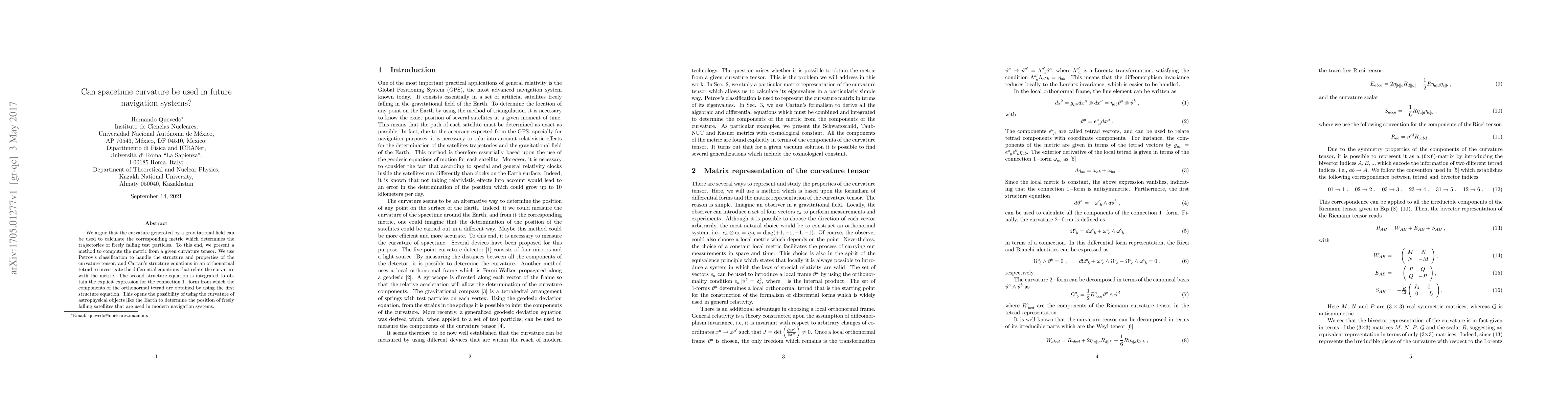We argue that the curvature generated by a gravitational field can be used to calculate the corresponding metric which determines the trajectories of freely falling test particles. To this end, we present a method to compute the metric from a given curvature tensor. We use Petrov's classification to handle the structure and properties of the curvature tensor, and Cartan's structure equations in an orthonormal tetrad to investigate the differential equations that relate the curvature with the metric. The second structure equation is integrated to obtain the explicit expression for the connection $1-$form from which the components of the orthonormal tetrad are obtained by using the first structure equation. This opens the possibility of using the curvature of astrophysical objects like the Earth to determine the position of freely falling satellites that are used in modern navigation systems.