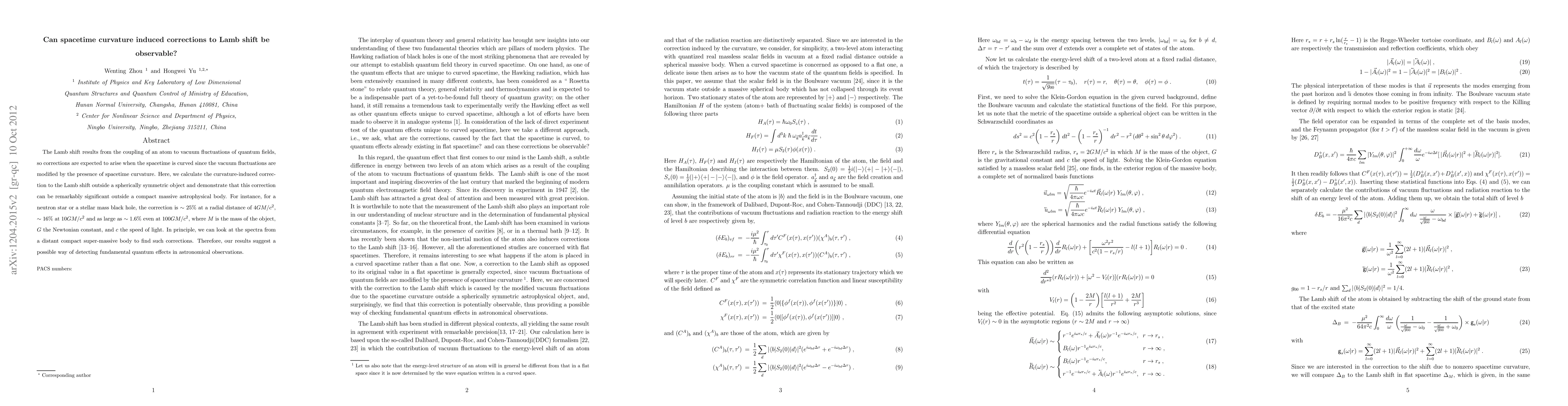 The study calculates significant spacetime curvature-induced corrections to the Lamb shift, a phenomenon caused by vacuum fluctuations of quantum fields, which could be detectable in astronomical observations.
