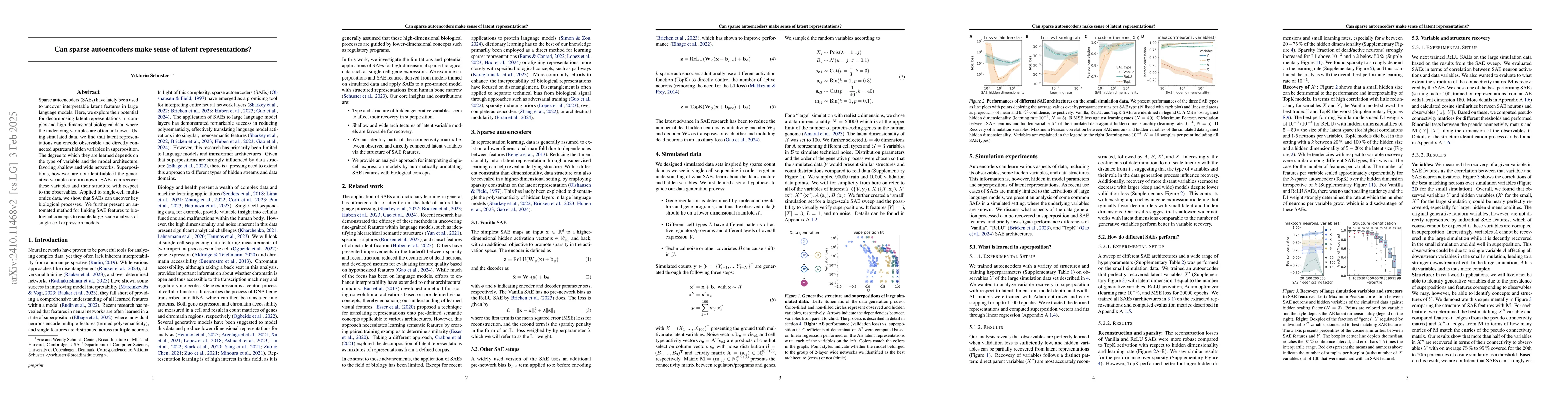 Sparse autoencoders (SAEs) have lately been used to uncover interpretable latent features in large language models. Here, we explore their potential for decomposing latent representations in complex and high-dimensional biological data, where the underlying variables are often unknown. On simulated data we show that generative hidden variables can be captured in learned representations in the form of superpositions. The degree to which they are learned depends on the completeness of the representations. Superpositions, however, are not identifiable if these generative variables are unknown. SAEs can to some extent recover these variables, yielding interpretable features. Applied to single-cell multi-omics data, we show that an SAE can uncover key biological processes such as carbon dioxide transport and ion homeostasis, which are crucial for red blood cell differentiation and immune function. Our findings highlight how SAEs can be used in advancing interpretability in biological and other scientific domains.