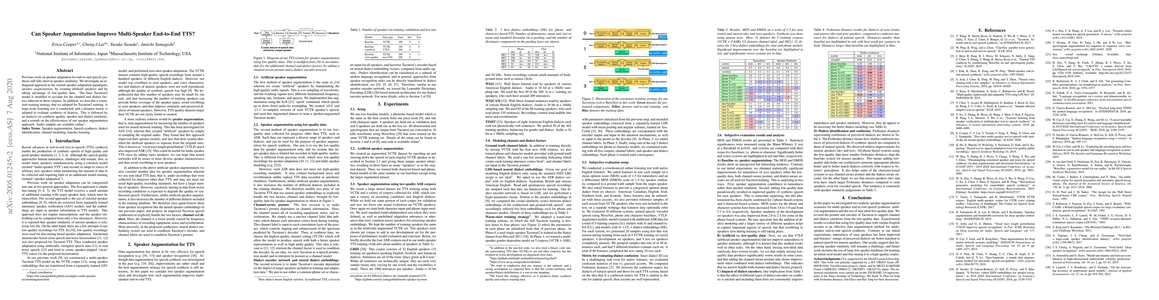 This paper explores speaker augmentation to enhance multi-speaker end-to-end text-to-speech (TTS) systems, creating artificial speakers and leveraging low-quality data. The modified Tacotron2 model and a warm-start training strategy are evaluated through a large-scale listening test, showing improved synthesis quality and speaker/dialect similarity.