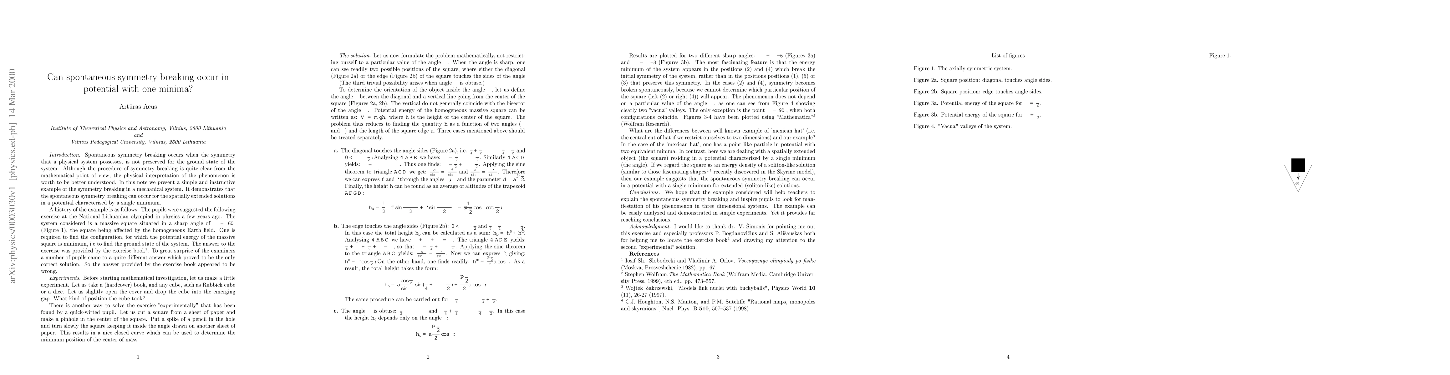 Two-line summary: Spontaneous symmetry breaking occurs when the ground state of a system does not preserve the system's symmetry. This paper presents a mechanical system example showing that spontaneous symmetry breaking can happen in a potential with a single minimum through spatially extended solutions.