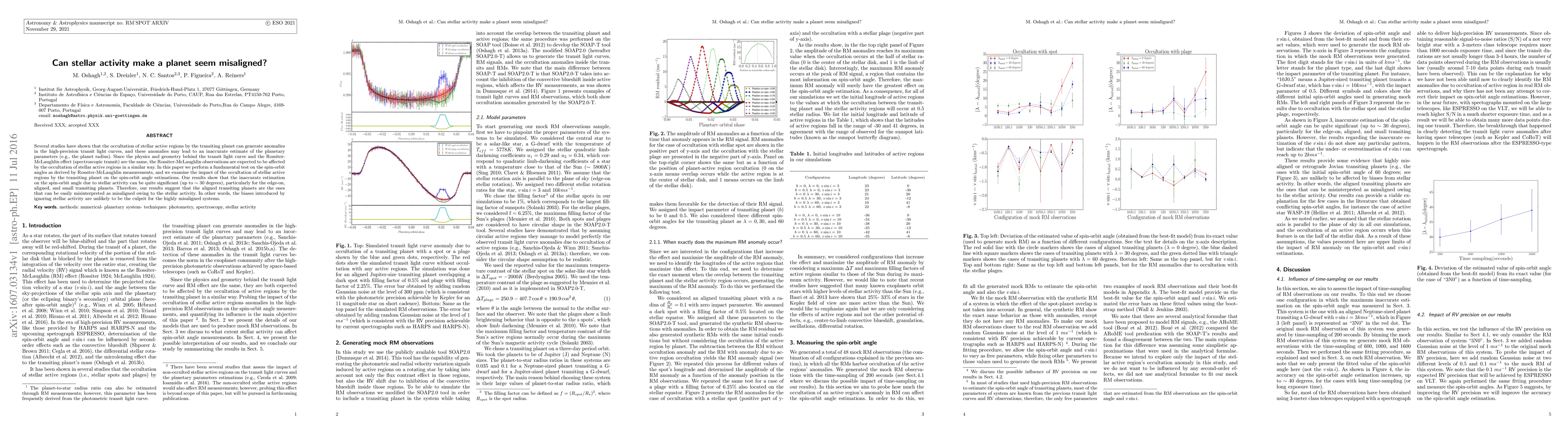This paper investigates how stellar activity can cause transiting planets to appear misaligned, finding significant inaccuracies (up to 30 degrees) in spin-orbit angle estimates due to the occultation of stellar active regions, especially for small, edge-on, aligned planets.