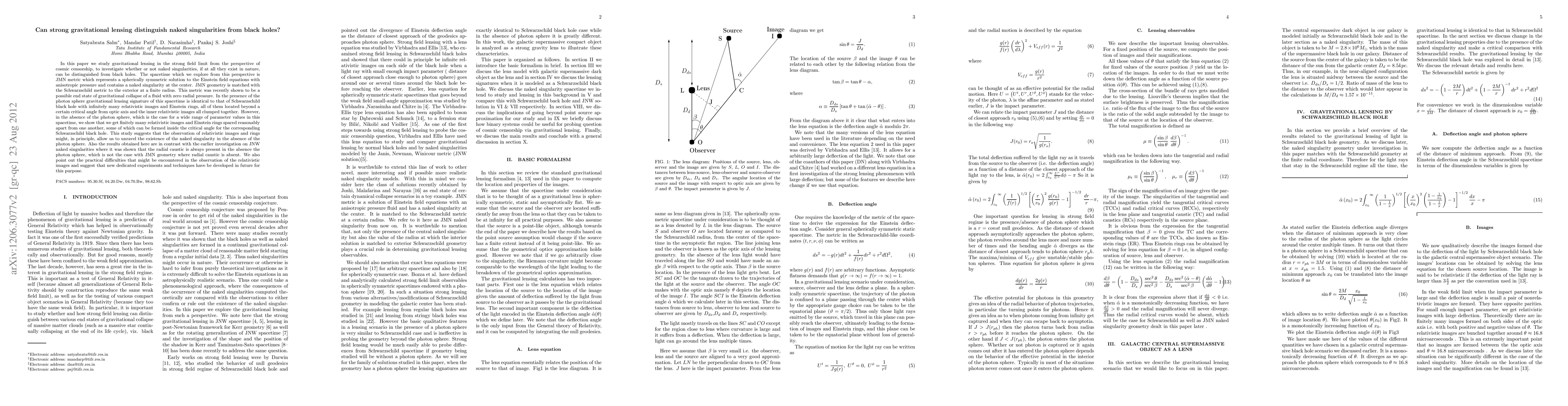 This paper investigates whether strong gravitational lensing can distinguish naked singularities from black holes in the JMN spacetime, finding that in the absence of a photon sphere, the lensing signature differs, potentially revealing naked singularities. However, practical observational challenges are noted, suggesting future experiments are needed.
