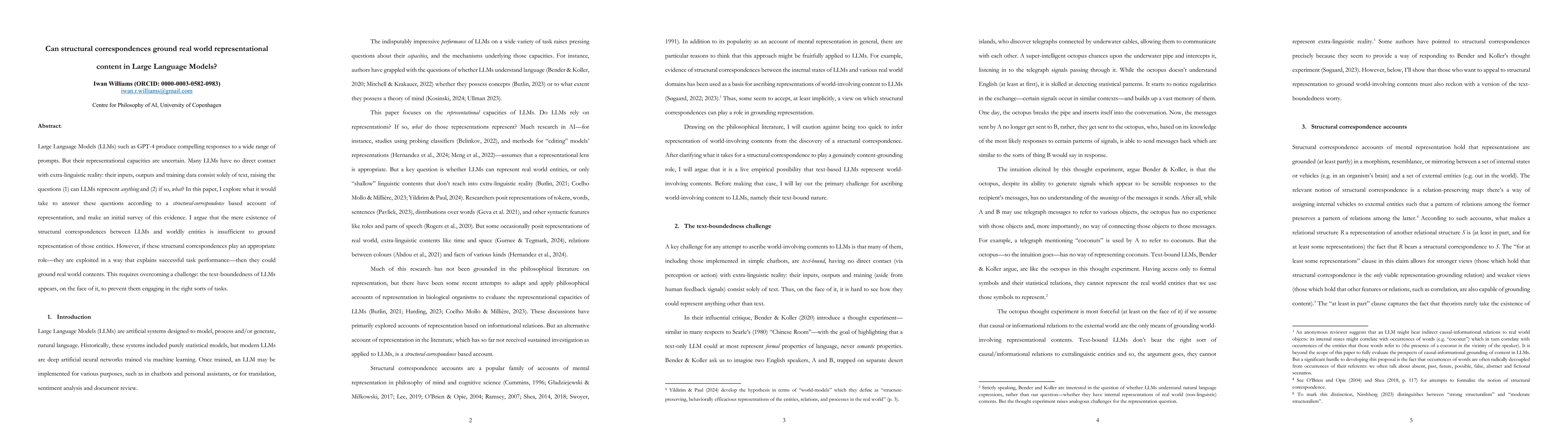 Large Language Models (LLMs) such as GPT-4 produce compelling responses to a wide range of prompts. But their representational capacities are uncertain. Many LLMs have no direct contact with extra-linguistic reality: their inputs, outputs and training data consist solely of text, raising the questions (1) can LLMs represent anything and (2) if so, what? In this paper, I explore what it would take to answer these questions according to a structural-correspondence based account of representation, and make an initial survey of this evidence. I argue that the mere existence of structural correspondences between LLMs and worldly entities is insufficient to ground representation of those entities. However, if these structural correspondences play an appropriate role - they are exploited in a way that explains successful task performance - then they could ground real world contents. This requires overcoming a challenge: the text-boundedness of LLMs appears, on the face of it, to prevent them engaging in the right sorts of tasks.