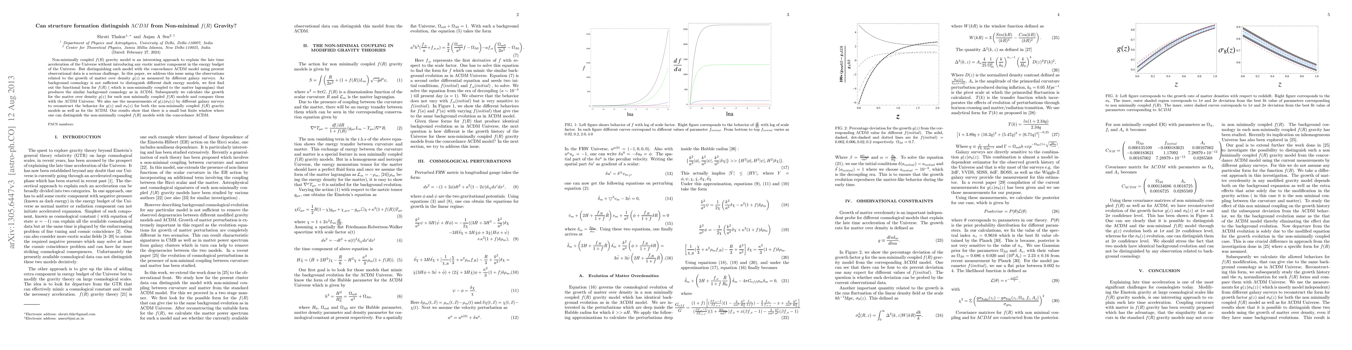 This paper explores whether structure formation can distinguish between the \Lambda CDM model and non-minimally coupled f(R) gravity, using observations of matter growth over density g(z) from galaxy surveys. The study finds a small but finite window where differences in g(z) allow for distinguishing these cosmological models.