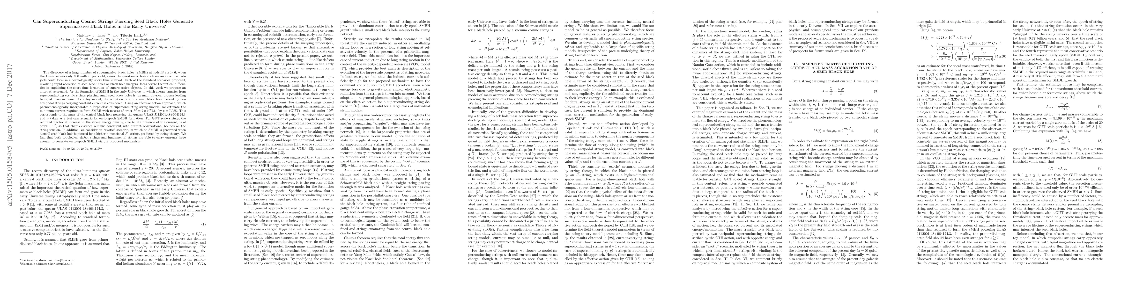 This paper proposes that superconducting cosmic strings piercing seed black holes could generate supermassive black holes (SMBH) in the early Universe by transferring energy to the seeds. It estimates the current required for GUT scale strings to form SMBHs, finding that their existence is consistent with observational constraints, and explores the possibility of higher-dimensional F-strings generating SMBHs.