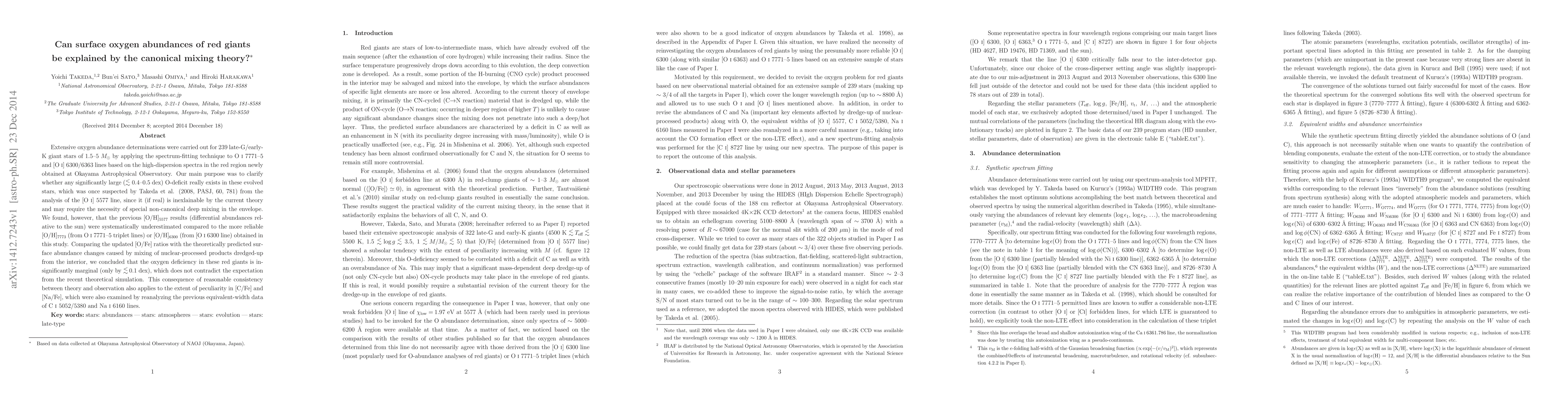 Extensive oxygen abundance determinations were carried out for 239 late-G/early-K giant stars of 1.5-5 M_sun by applying the spectrum-fitting technique to O I 7771-5 and [O I] 6300/6363 lines based on the high-dispersion spectra in the red region newly obtained at Okayama Astrophysical Observatory. Our main purpose was to clarify whether any significantly large (<~0.4-0.5 dex) O-deficit really exists in these evolved stars, which was once suspected by Takeda et al. (2008, PASJ, 60, 781) from the analysis of the [O I] 5577 line, since it (if real) is inexlainable by the current theory and may require the necessity of special non-canonical deep mixing in the envelope. We found, however, that the previous [O/H]_5577 results (differential abundances relative to the sun) were systematically underestimated compared to the more reliable [O/H]_7773 (from O I 7771-5 triplet lines) or [O/H]_6300 (from [O I] 6300 line) obtained in this study. Comparing the updated [O/Fe] ratios with the theoretically predicted surface abundance changes caused by mixing of nuclear-processed products dredged-up from the interior, we concluded that the oxygen deficiency in these red giants is insignificantly marginal (only by <~0.1 dex), which does not contradict the expectation from the recent theoretical simulation. This consequence of reasonable consistency between theory and observation also applies to the extent of peculiarity in [C/Fe] and [Na/Fe], which were also examined by reanalyzing the previous equivalent-width data of C I 5052/5380 and Na I 6160 lines.