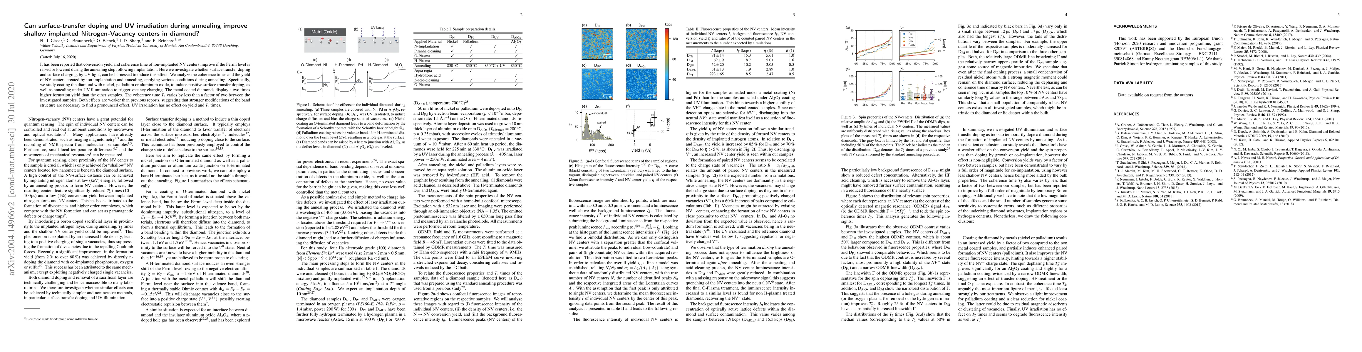 This study explores whether surface-transfer doping and UV irradiation during annealing can enhance the yield and coherence time of nitrogen-vacancy (NV) centers in diamond. Results show that metal-coated diamonds have a higher NV center formation yield but UV irradiation does not significantly affect yield or coherence time.