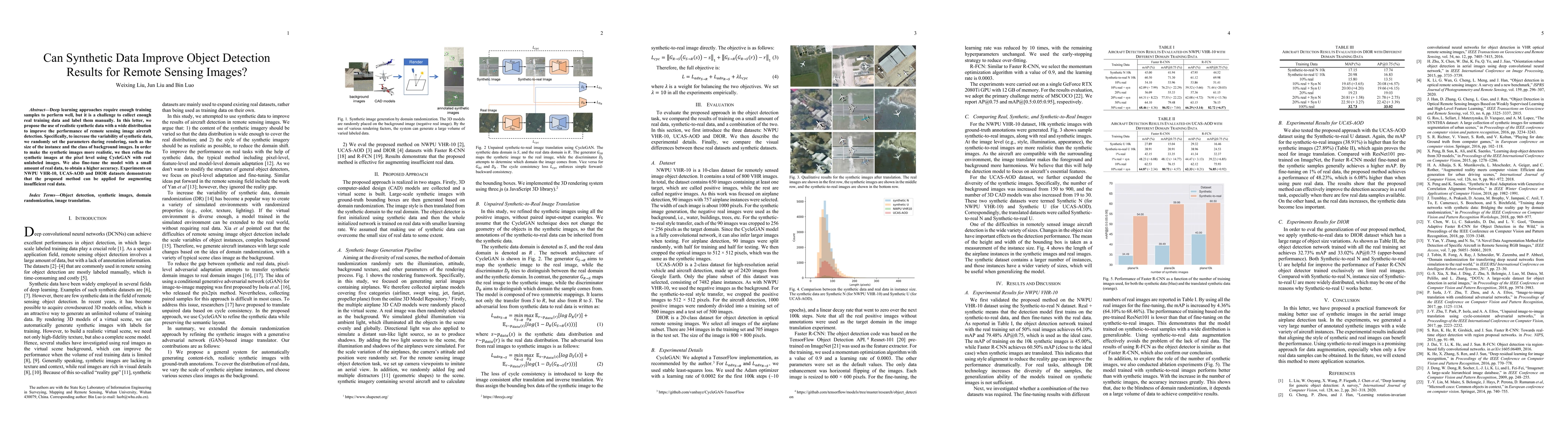 Deep learning approaches require enough training samples to perform well, but it is a challenge to collect enough real training data and label them manually. In this letter, we propose the use of realistic synthetic data with a wide distribution to improve the performance of remote sensing image aircraft detection. Specifically, to increase the variability of synthetic data, we randomly set the parameters during rendering, such as the size of the instance and the class of background images. In order to make the synthetic images more realistic, we then refine the synthetic images at the pixel level using CycleGAN with real unlabeled images. We also fine-tune the model with a small amount of real data, to obtain a higher accuracy. Experiments on NWPU VHR-10, UCAS-AOD and DIOR datasets demonstrate that the proposed method can be applied for augmenting insufficient real data.