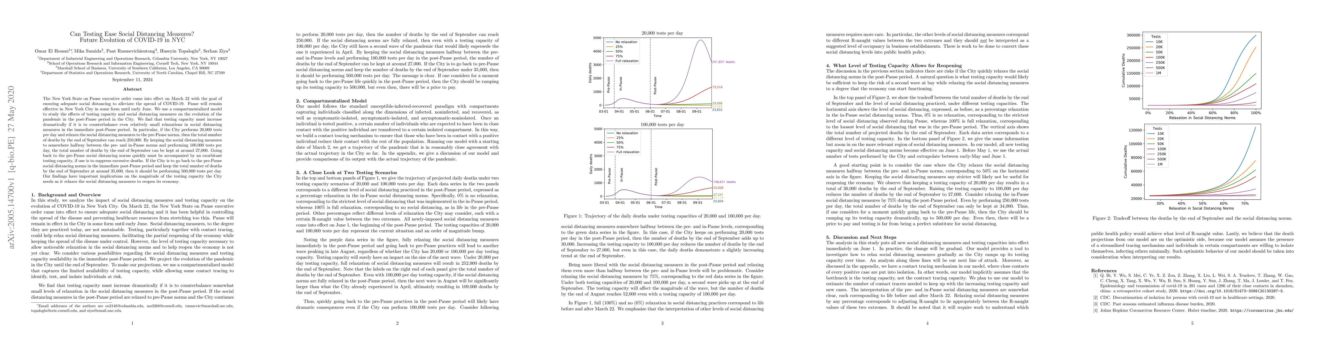 The "New York State on Pause" executive order came into effect on March 22 with the goal of ensuring adequate social distancing to alleviate the spread of COVID-19. Pause will remain effective in New York City in some form until early June. We use a compartmentalized model to study the effects of testing capacity and social distancing measures on the evolution of the pandemic in the "post-Pause" period in the City. We find that testing capacity must increase dramatically if it is to counterbalance even relatively small relaxations in social distancing measures in the immediate post-Pause period. In particular, if the City performs 20,000 tests per day and relaxes the social distancing measures to the pre-Pause norms, then the total number of deaths by the end of September can reach 250,000. By keeping the social distancing measures to somewhere halfway between the pre- and in-Pause norms and performing 100,000 tests per day, the total number of deaths by the end of September can be kept at around 27,000. Going back to the pre-Pause social distancing norms quickly must be accompanied by an exorbitant testing capacity, if one is to suppress excessive deaths. If the City is to go back to the "pre-Pause" social distancing norms in the immediate post-Pause period and keep the total number of deaths by the end of September at around 35,000, then it should be performing 500,000 tests per day. Our findings have important implications on the magnitude of the testing capacity the City needs as it relaxes the social distancing measures to reopen its economy.
